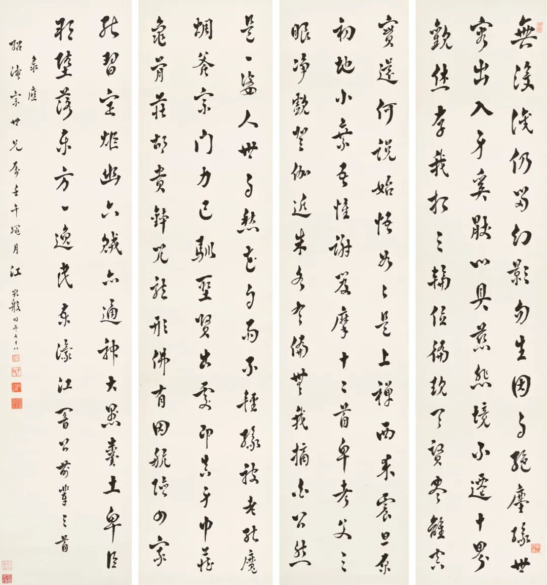 水墨纸本 镜片四幅江孔殷(1864年-1952年),字少泉,别号霞公,人称江虾,籍贯广东南海(现广州)。由于江孔殷是晚清最后一届科举进士,曾入太史院,故又被称为江太史。江太史最为后世称道的是他美食家的身份,曾有“百粤美食第一人”之美誉。江太史家中食谱有“太史菜谱”之称,其中以蛇宴最为闻名,太史五蛇羹更在坊间广为流传。