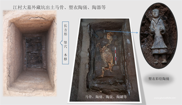 江村大墓平面为“亞”字形,地表无封土,墓室边长约72米、深30余米,墓室四周发现110多座外藏坑。据了解,考古工作者发掘了江村大墓的8座外藏坑,随之出土陶俑、铜印、铜车马器及铁器、陶器等1500余件,铜印印文有“车府”“器府”“中骑千人”“府印”“仓印”“中司空印”等,皆表明江村大墓周围外藏坑应为模仿现实官署、府库建造。江村大墓的形制、规模均符合西汉最高等级墓葬规格,加之其周边分布窦皇后陵、薄太后陵,专家遂确认江村大墓即为汉文帝霸陵。