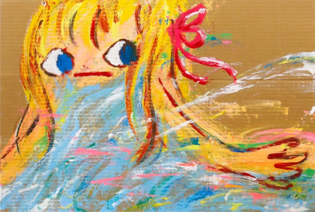 近年备受市场与藏家喜爱,日本新一代艺术家六角彩子以徒手上色的创作技巧闻名,偌大的女孩、充满童稚的大眼睛,水蓝色洋装与头上的桃红色蝴蝶增添了女孩俏皮、浪漫的氛围,也是六角彩子最具标志性的作品风格。
