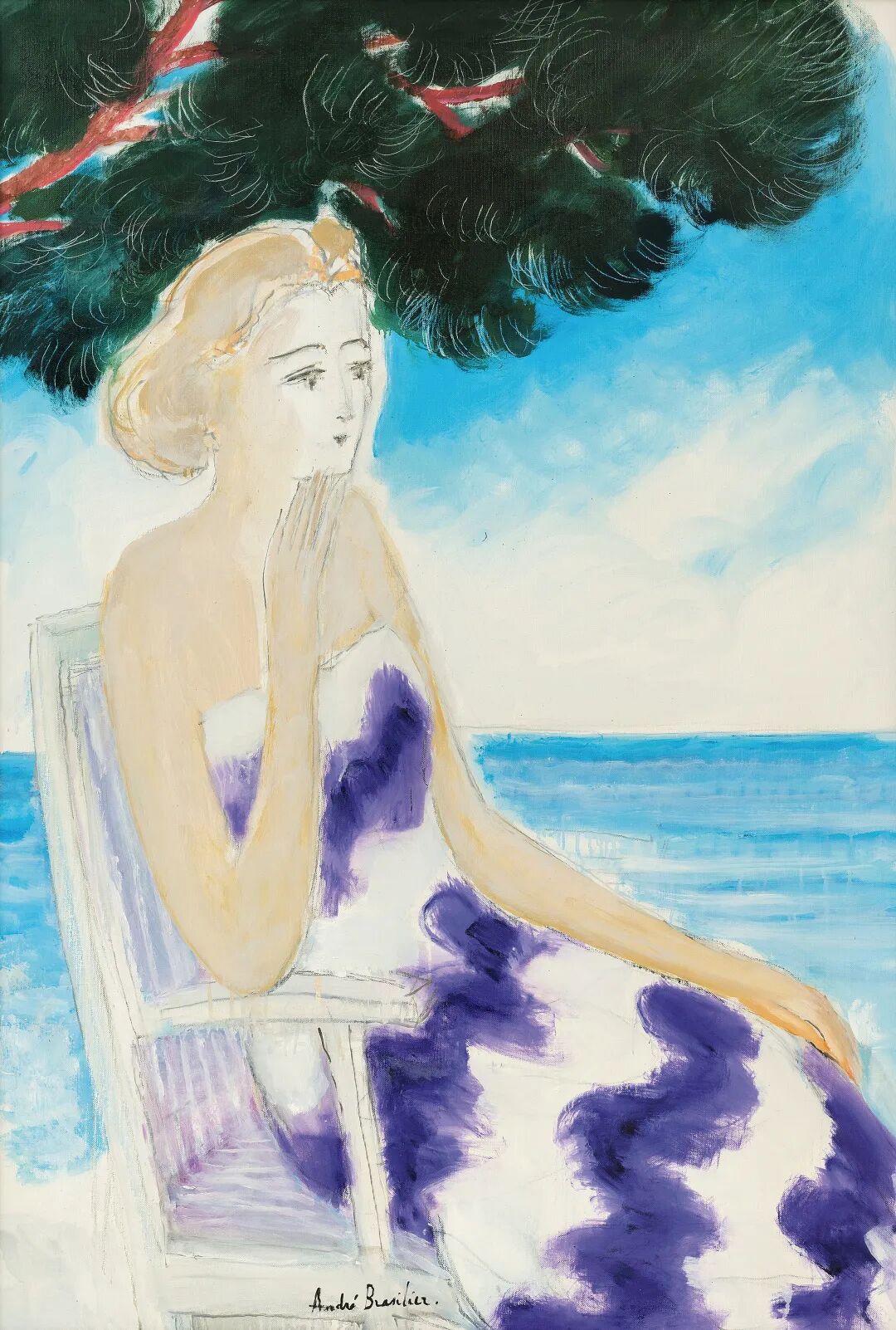 安德烈·布拉吉利是法国当代艺术重要画家之一,也是“巴黎画派”硕果仅存的在世名家。布拉吉利的作品经常以马匹、大自然、音乐和女性为主题,表达恬静纯洁的内心世界。他画面中的女性,往往有着同样的面容,这个人便是布拉吉利的妻子香黛尔,“香黛尔总是在我身边,每时每刻,我都从他举止的高贵和脸庞的美丽中感受到幸福。”《松下美人》正式这样一件布拉吉利对妻子的描绘之作,以着装与色彩突出人物的主体性,寥寥几笔将人物的情态勾勒,捕捉动人的瞬间。
