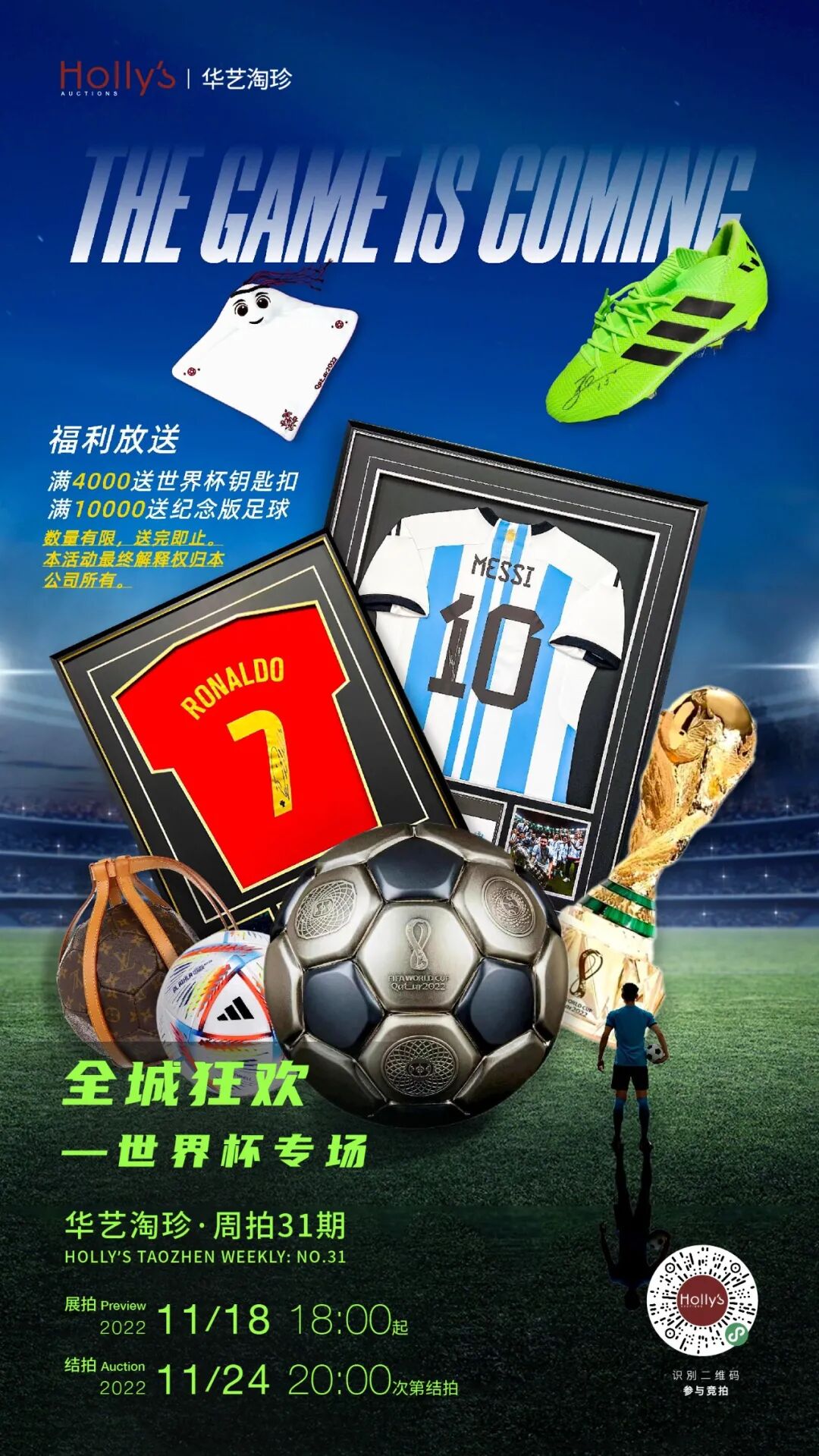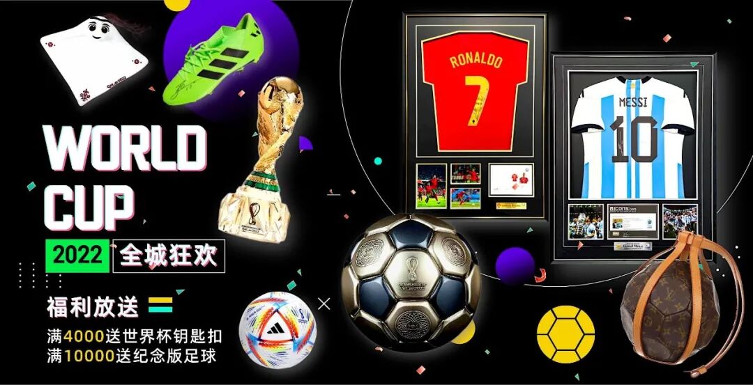 2022年卡塔尔世界杯已到,多哈街头热情洋溢。镜头回转到我们城市,街巷也因世界杯而狂欢,聚焦卡塔尔。本期华艺淘珍“全城狂欢——世界杯专场”,为大家带来足坛精选珍品,有球星亲签球衣、球鞋,世界杯周边珍藏品,精致的奢侈品礼品等。同时,将福利放送给您,满4000赠送世界杯吉祥物钥匙扣(1个),满10000赠送纪念版足球(1个)。共同感受卡塔尔世界杯的热情,点燃冬天里的一把火。