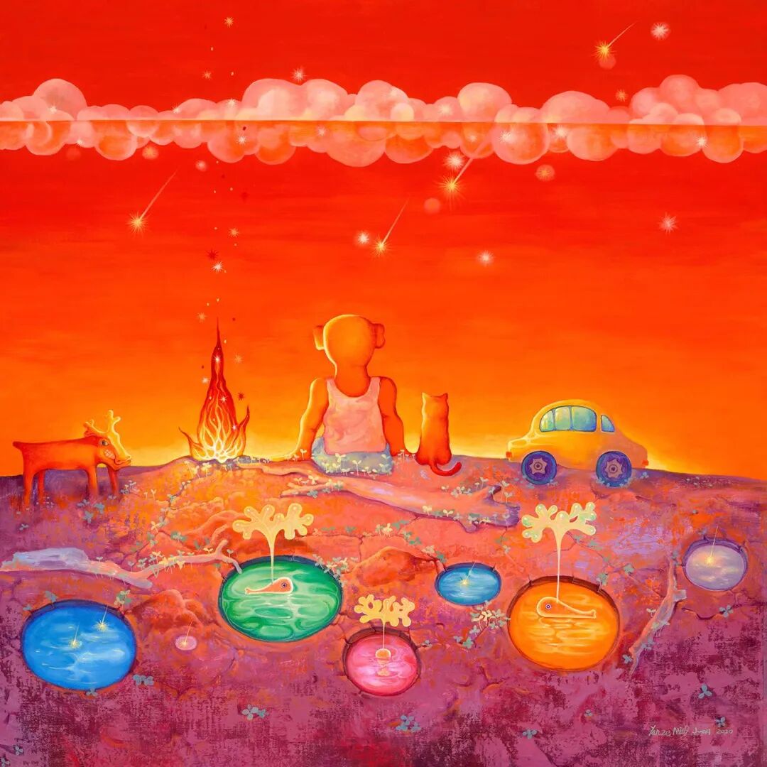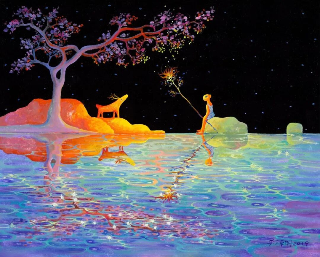 无论山水景色还是人物动物,严泽明的作品都传递着一种极致的清澈纯真之美,诉说着关于守护、坚持、拥抱、陪伴等温暖动人的情感。这一系列赋能当代社会积极人文底蕴精神的作品,传达的都是艺术家一直坚持的创作理念——“照见自我,温暖世界”。徜徉山水间抑或遨游趣味乐园,画中的喜怒哀乐,都是艺术家的人文关照意识呈现。