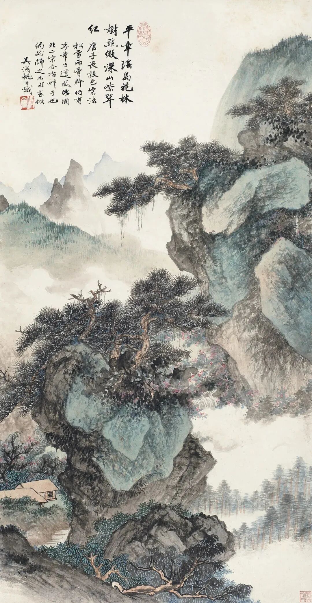 款识:平章瑶岛花林树,点缀深山紫翠红。唐子畏设色,宗法松雪而骨干仍有李希古遗风,此南北二宗合冶神手也,偶然师之,不求甚似。吴湖帆并识。