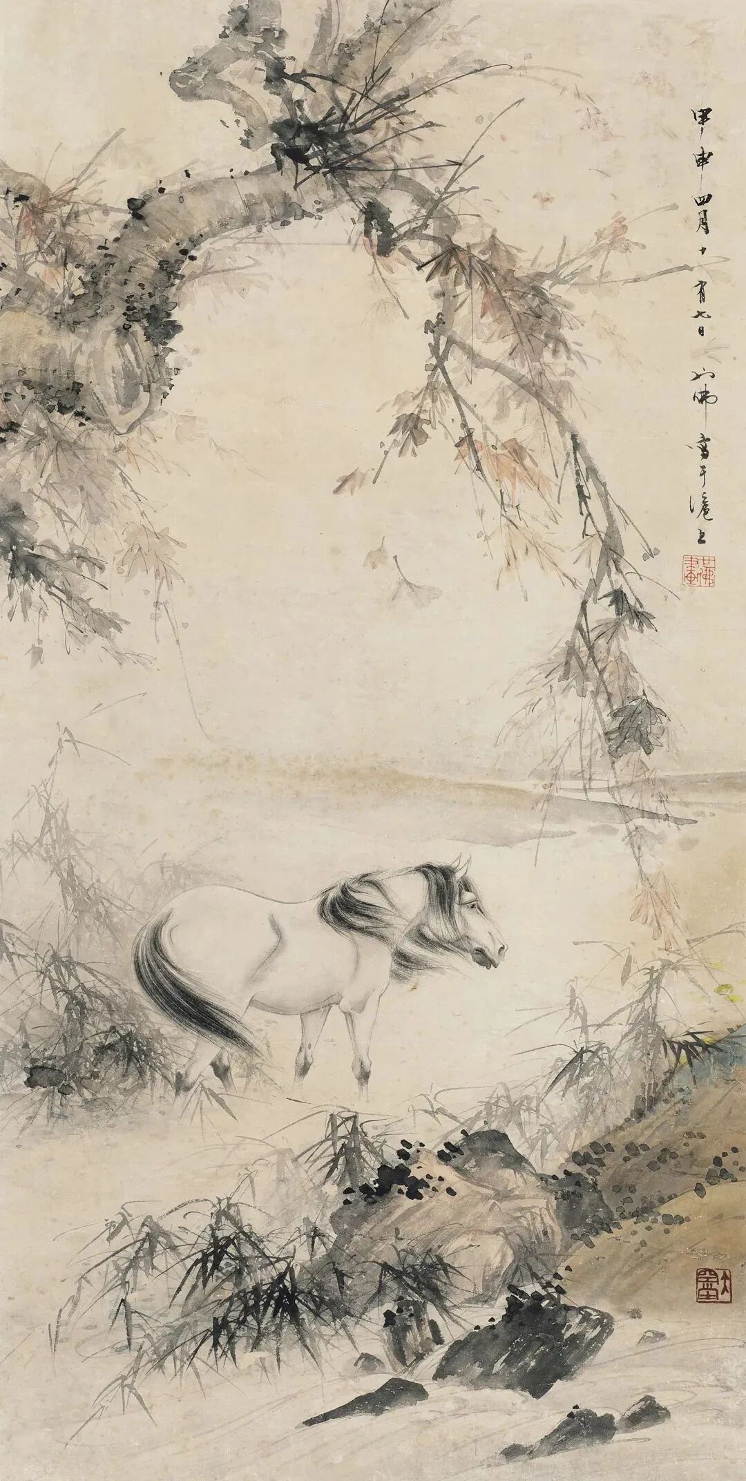 胡也佛早年以“铁线游丝”绝艺独步天下,复以描摹世情的秘戏图、春宫画驰名宇内,算是一位不世出的风情艺术大师。在秘戏题材画里,翎毛走兽本就是必不可少的意象。他1944年作《立马图》,即绘骏马立于竹溪水中,马首同时昂然望向画外;远景云水苍茫,不可极目,整幅颇有“挥手自兹去,萧萧班马鸣”的意境。而其构思奇特,以骏马翘首而赋依依惜别之意,直是想落天外,令人不禁拍案叫绝。