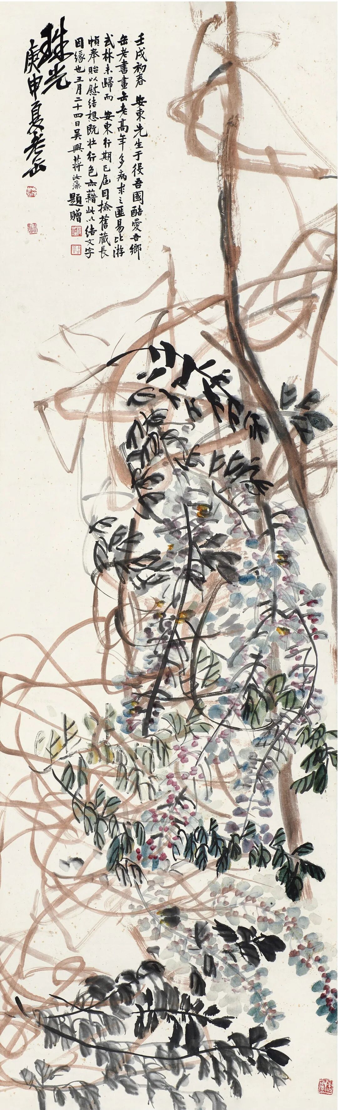 题跋:壬戌(1922年)初春。安东先生于役吾国,酷爱吾乡缶老书画。缶老高年多病,求之匪易,比游武林未归。而安东行期已届,目检旧藏长帧奉贻,以慰结想既壮行色,亦藉此以结文字因缘也。三月二十四日,吴兴蒋汝藻题赠。钤印:蒋汝藻、孟宾