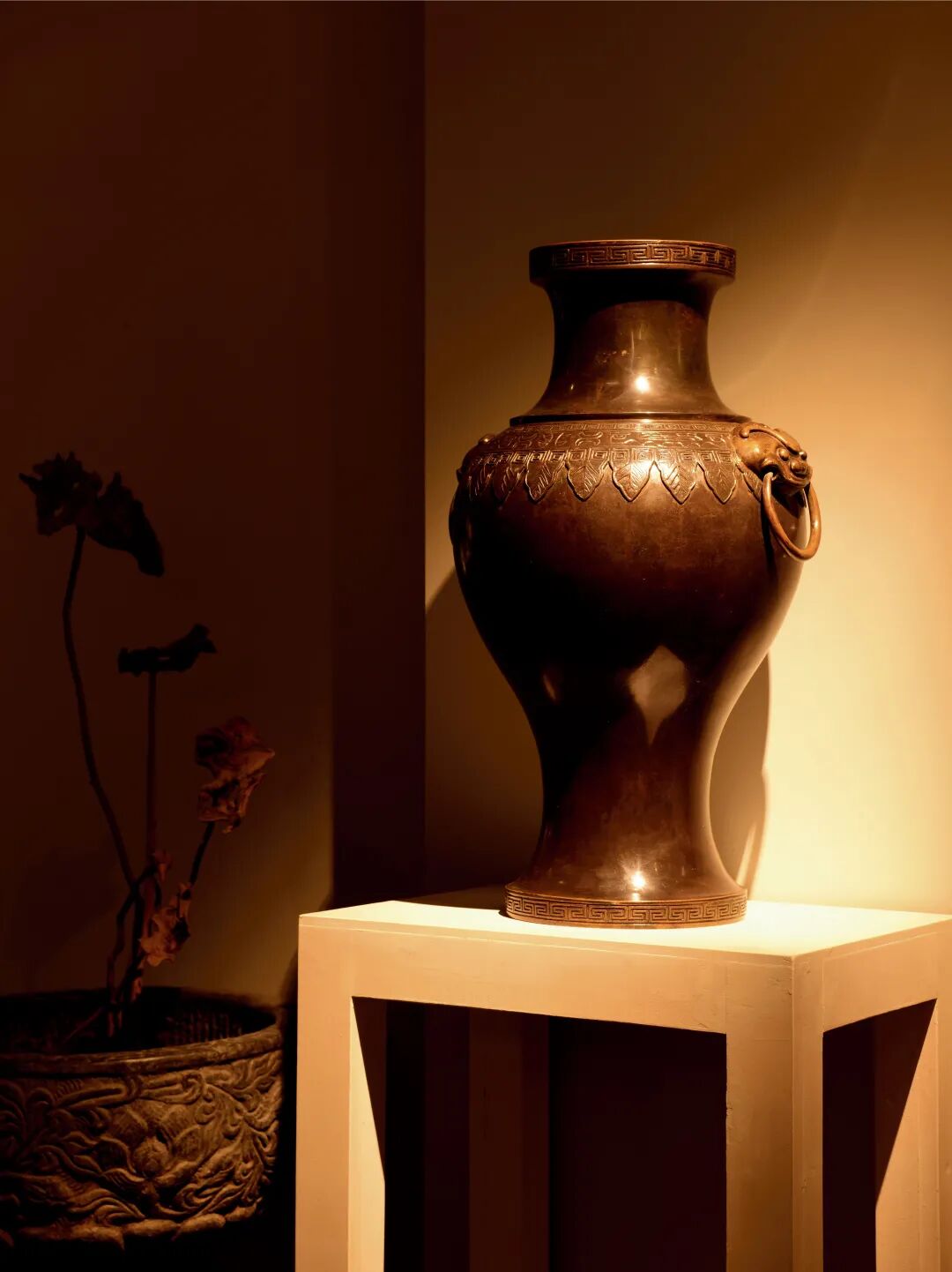 这件铜瓶造型匀称,古朴大方而不失灵动,纹样题材丰富而不繁复,展现出一种高雅、内敛的古典之美。铺首衔环寓意富贵吉祥,加之活环机巧,铸造工艺高超而娴熟,非官造不能胜任,是一件难得的清中期宫廷佳作。