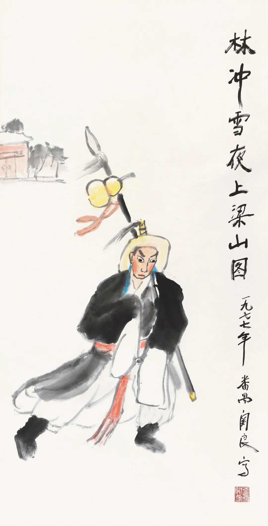 款识:林冲雪夜上梁山图,一九七七年番禺关良写。