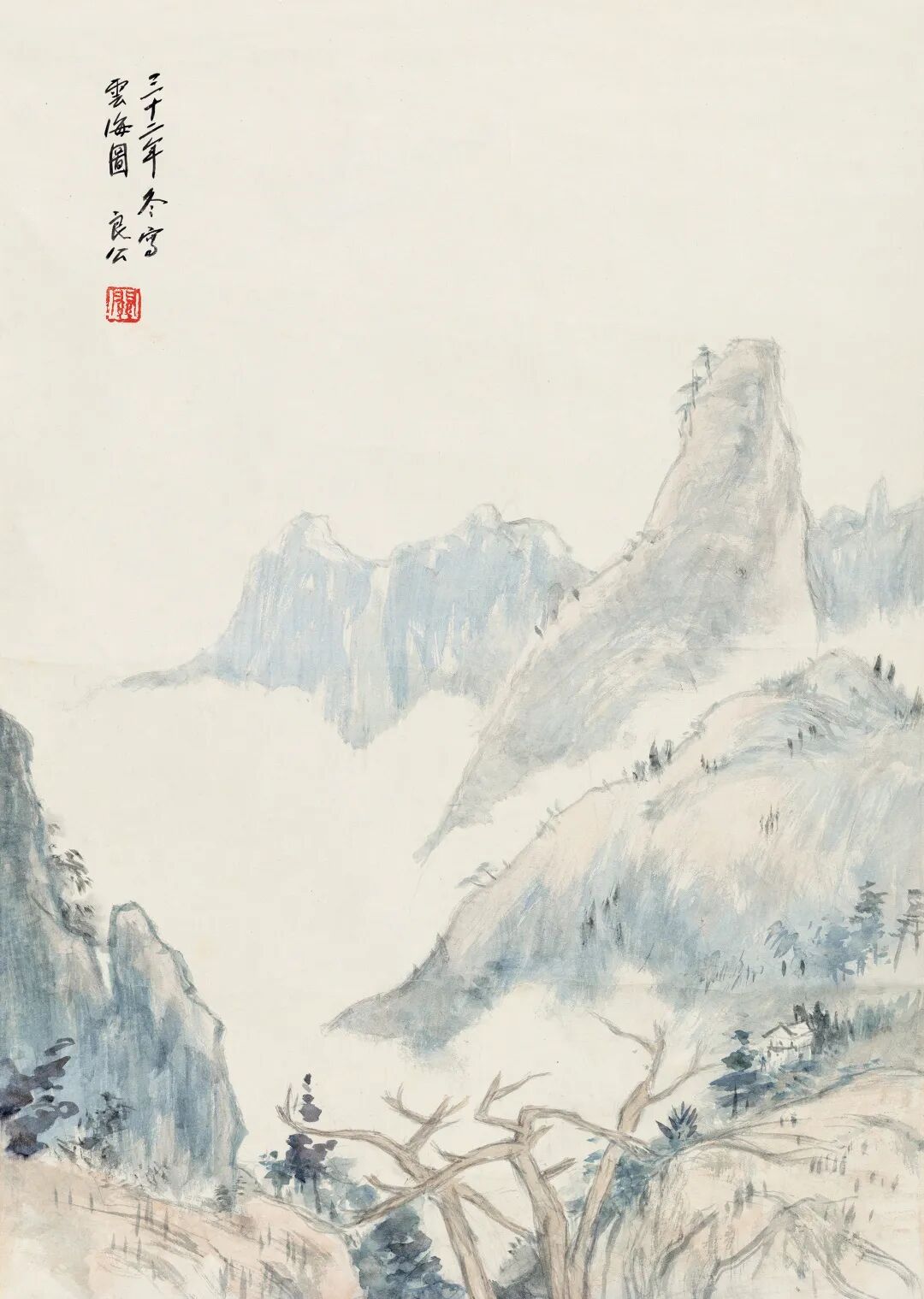 款识:三十二年冬写云海图,良公。