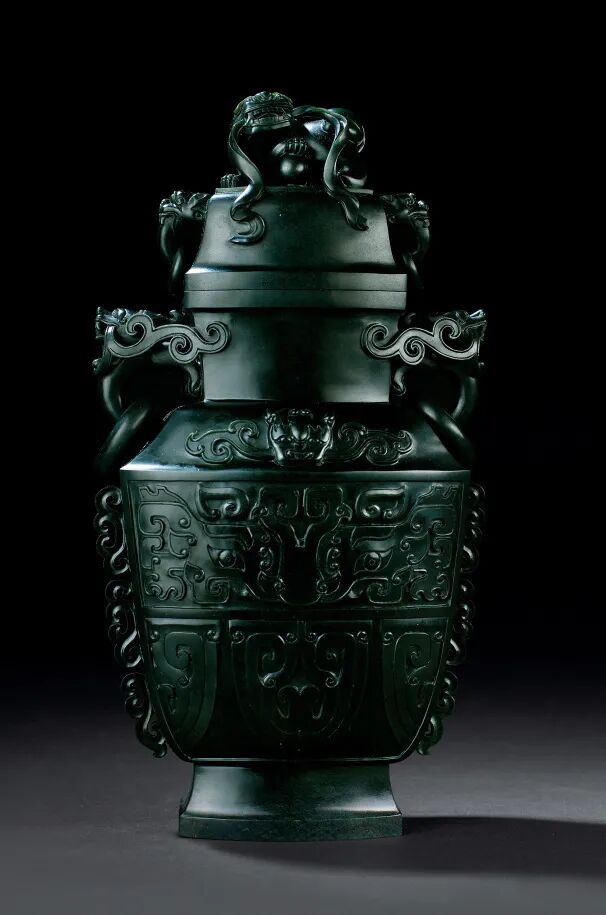 此瓶分器、盖两个部分。瓶颈两侧雕一对龙首,威武肃穆,生动形象。瓶身浮雕仿古饕餮纹,古雅大气,敦厚庄重,线条流畅。瓶盖两侧雕兽首,上端雕狮子,嘴咬飘带,爪握绣球,威武霸气。整器古朴工艺考究,线条分明,生动立体,富有艺术价值和收藏价值。