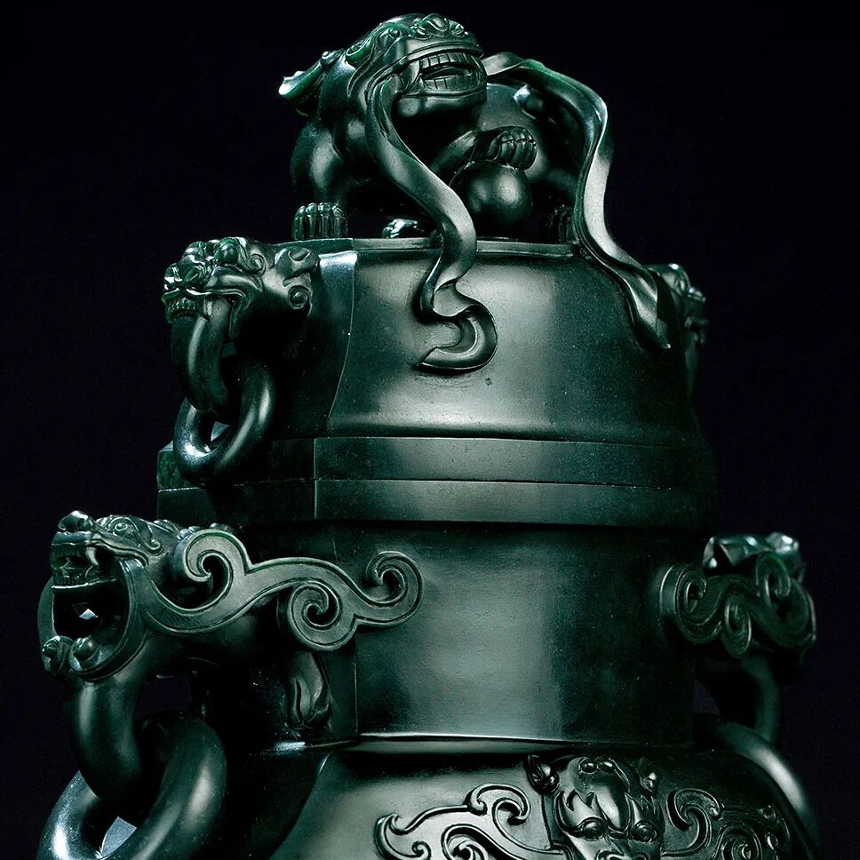 和田墨玉 饕餮龙耳狮钮瓶
