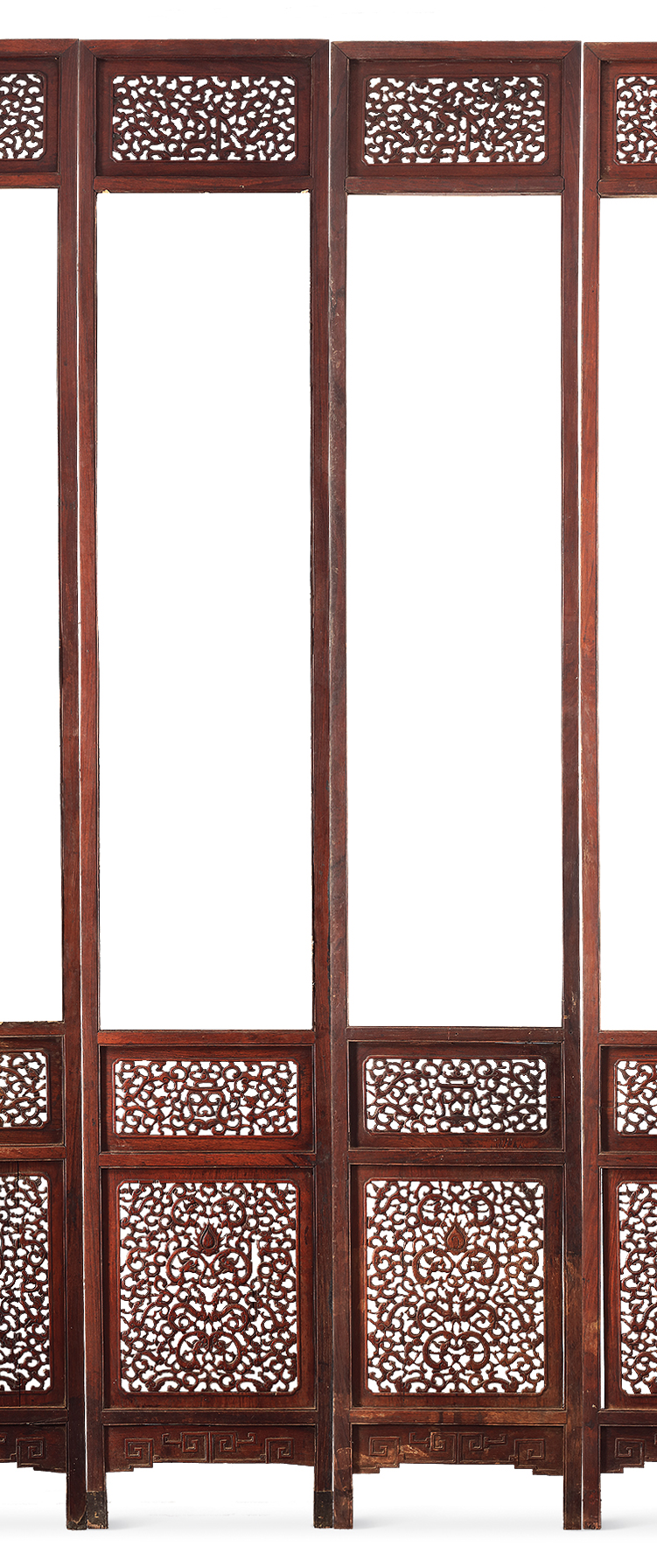 “中国古典家具集珍”11件(套)家具来源清晰,流传有序。虽数量不多,但黄花梨紫檀家具仍是分量十足,其中清早期黄花梨如意云纹独板面大供案尤为特别。此案高逾一米,壮美尚不落俗套,具明式家具简约之美,为供案之佼佼者。又有清早期黄花梨螭龙福寿纹围屏12扇成套,透雕纹饰,玲珑富贵。此外清宫廷家具亦珍品纷呈,清乾隆紫檀云龙纹五屏罗汉床,京剧名家荀慧生“小留香馆”递藏,是材质与雕刻精彩结合的紫檀家具典范。