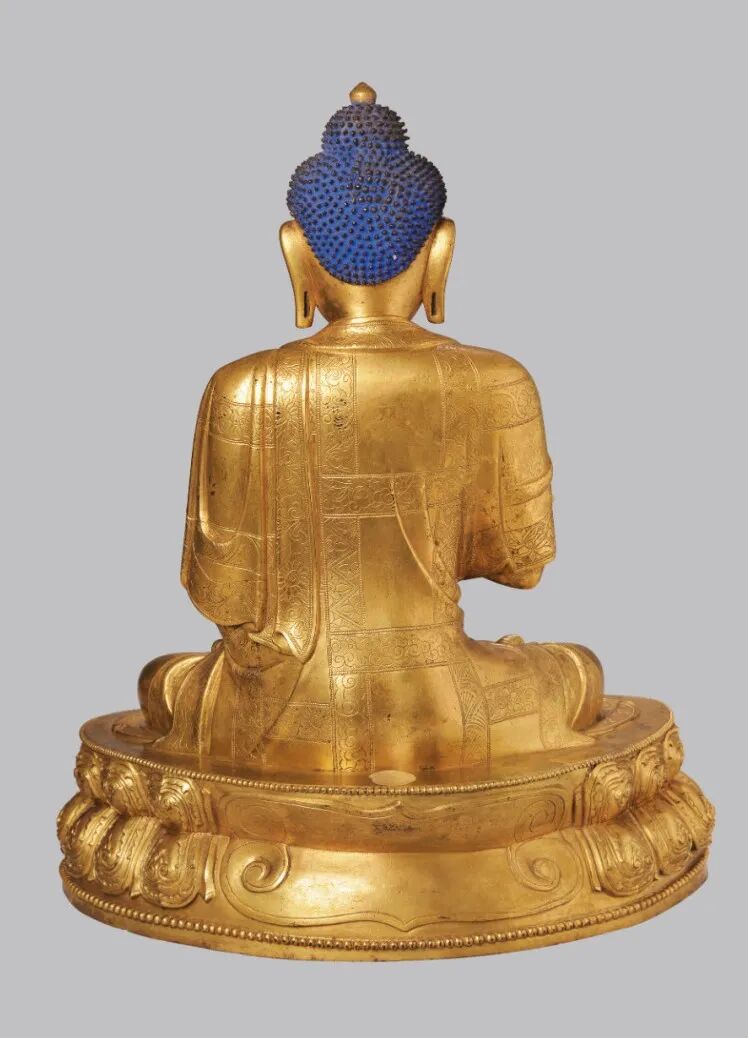简而言之,康熙早期也是康熙时代的盛期,其各个门类的工艺美术都富有极其强烈的时代风格,纹饰华丽,气质中正慈祥,此尊燃灯佛像眉间白毫以红宝石为材镶嵌,此种装饰方式可参考同时期清宫旧藏之观音像、无量寿佛像等,为清初宫廷造像的典型工艺方法,乌尔里希·冯·施罗德曾针对这一工艺方法提出,“值得注意的是半宝石的使用,它表明这类造像可能为藏人而创作”,也更进一步印证了此尊造像应为康熙朝早期清代宫廷中藏人所主持的宫廷造像作坊所制作,与后期蒙人的造像方法上仍有较大区别。与现存清宫旧藏之清代初期宫廷造像相比,此尊佛陀像仍属于体量极大者。与之同时期的宫廷造像题材中可见数件带编号之无量寿佛,尺寸较此件燃灯佛皆略小,但其开脸方式、铜胎质量等皆相似,此件之金水则更为澄黄明亮,应为北京宫廷、行宫或皇家寺庙等重要佛堂所供奉的精铸造像,殊胜难得。直到康熙二十七年(1688年),漠西蒙古的准噶尔部大举入侵喀尔喀蒙古,哲布尊丹巴率部内附,三十年,康熙帝召集内外蒙古各部王公贵族举行了著名的多伦会盟,宣布一世哲布尊丹巴为大喇嘛,从此之后,宫廷造像转而展现出更多的蒙古风格影响。尤其是康熙帝晚年,身心憔悴,疾病缠身,这也促使他转向佛教信仰,宫中唐卡供奉以白度母为主,铜像铸造以无量寿佛常见,就是这个原因。纵观康熙朝宫廷造像,在时间跨度达半个多世纪的岁月中,数量并不多,但几乎全部铜质厚重,做工精良,素为藏家所重。其题材内容相对内容单一,以无量寿佛为主,且常用以赏赐其各地王公贵族,体量较小者常见。由此可见,以燃灯佛为题材,且尺寸如此之大,做工如此之精良者,于康熙时期亦属极为珍罕之精品,其既是对于清代早期政教文化发展的一种见证,亦是举国蒸蒸日上、日益强盛的一种宗教表达。“燃灯佛”即过去佛,为释迦牟尼之前的佛,佛经中记载燃灯佛出生时身边一切光明如灯,故称为燃灯佛。佛经中将一个宇宙从生到灭称为一个“大劫”,释迦牟尼所在的现世即现在的劫称为“贤劫”,燃灯佛为贤劫之前“庄严劫”的佛。燃灯佛曾预言释迦牟尼的前身在贤劫中将成佛,并向他授记,因而燃灯佛也被称为“过去佛”。清乾隆 白檀雕兽面福寿佛龛供铜鎏金药师佛