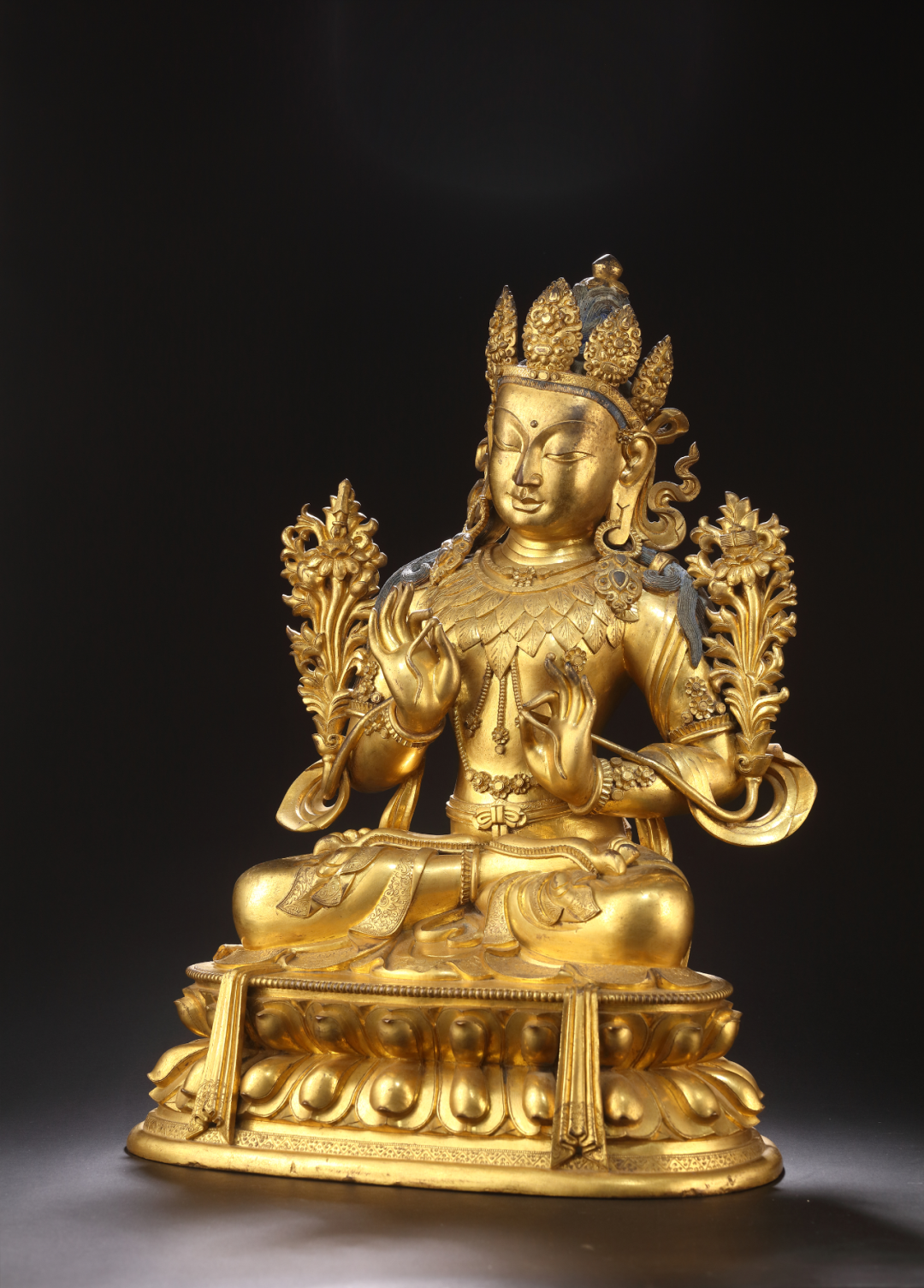 清代宫廷造像做工精细,风格成熟,为汉藏融合式风尚的成熟期。康熙、雍正及乾隆三朝宫廷造像则将蒙古、汉地的造像精粹相融合,并于此之上,以藏传佛教的风格和铸造工艺,创造性地发展出更加华美而具雄阔气度之佛像风格。此尊文殊菩萨无论从造型或工艺,均显示出极高的艺术品质,展现出清代宫廷金铜佛造型艺术之鲜明特点,其工艺精湛,品相完好,金水澄亮,体量巨大达43.8公分,而今仍旧保留有完美的宫廷气息,难得尤甚。