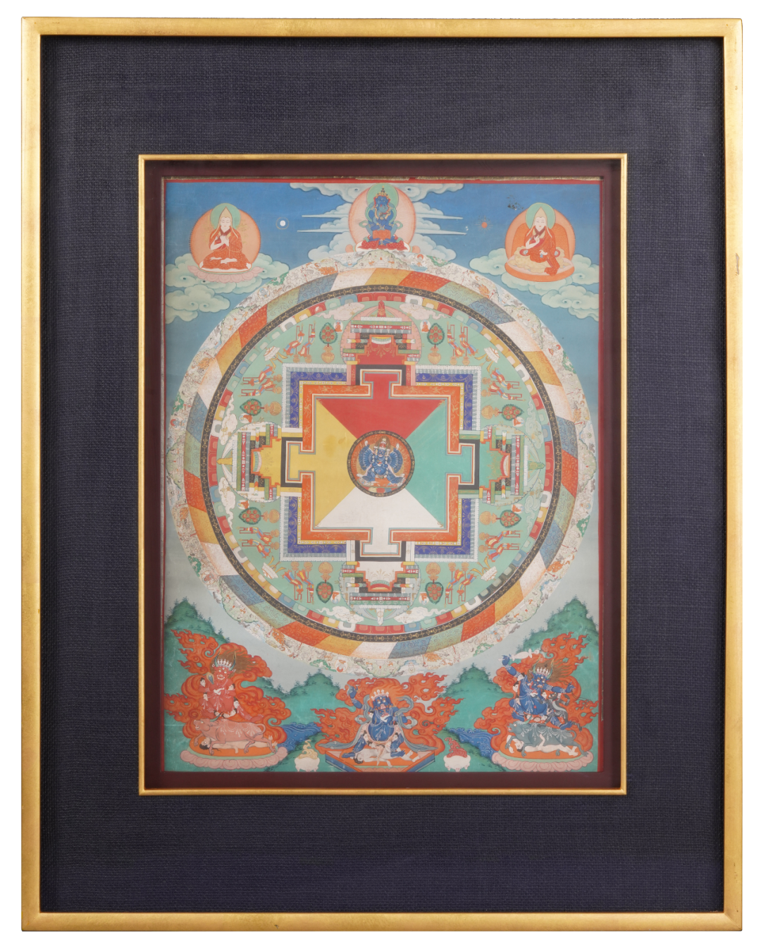 此幅大威德金刚坛城唐卡画工精湛,施色保存明艳,品相极佳。坛城中央为方城,呈井字形,正中圆圈内绘大威德金刚双身像,主尊身蓝色,有九头三十四臂和十六足,拥抱明妃金刚起尸母。主尊四方的四个三角区域内平涂白、黄、红、绿各色,表示东、南、西、北四方佛国(坛城下方为东,其他三方呈顺时针方向分布)。坛城四面均有T形入口,由内而外依次为饰有华丽帷幔的三瓣圆弧拱门、金碧辉煌的宫殿以及拱卫宫殿的摩羯兽。坛城最外层由内向外依次为莲花轮、金刚轮、般若烈焰守护轮和寒林墙。各墙组成的图案及寓意各不相同:莲花墙由不同色彩的莲花瓣构成,象征清净无染;金刚墙由金刚杵首尾相接而围成,代表坚固不可摧破;火焰墙由五种不同色彩的祥云形火焰呈顺时针方向猎猎燃烧,象征智慧;八大寒林墙由八组不同的人物和景物构成,代表可以镇压一切邪魔外道。其中,寒林墙最为突出,它由大猛、枯骨、金刚焰、稠丛、狂笑、上祥、幽暗和啾啾等景象组成,每处细节均显示出阴森恐怖的景象,有山狱、树木、河流、修行僧侣、天神、畜生及散布的断手残肢等。