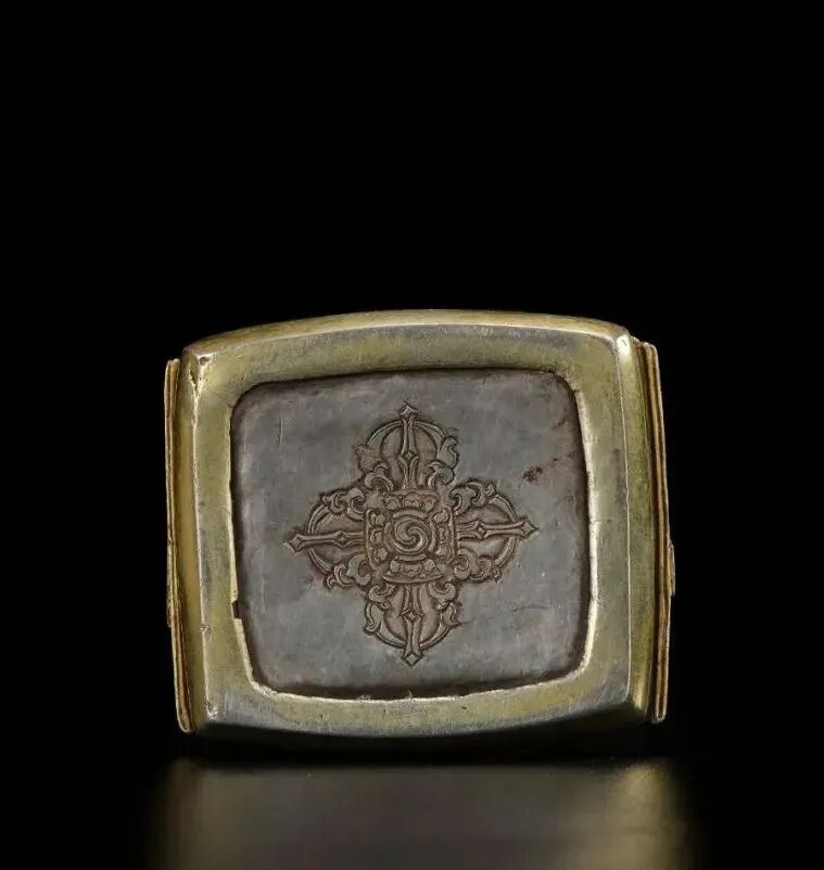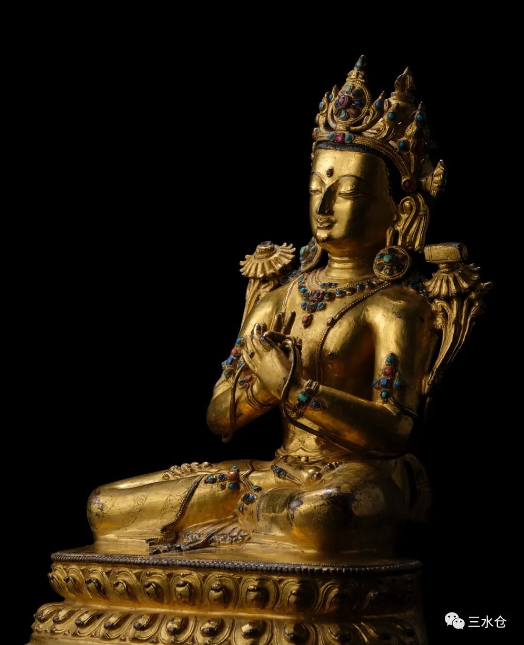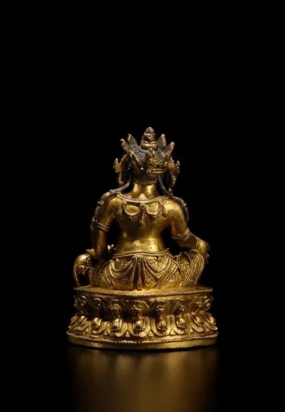 例如相比于常见的扎纳巴扎尔造像,菩萨的五官更为锐利,眉毛的弧度更直,下巴也更尖。同时,从作品的塑造技艺来看,作品更呈现出更为典型的清宫手法。如扎纳巴扎尔造像以一种相当独特的方式将人物铸造在基座之上,而这件作品分体铸造的几个分体铸造的部分并未直接焊接在一起,取而代之的是以榫头和榫眼的方式作为连接。