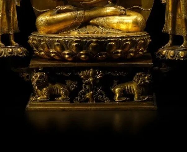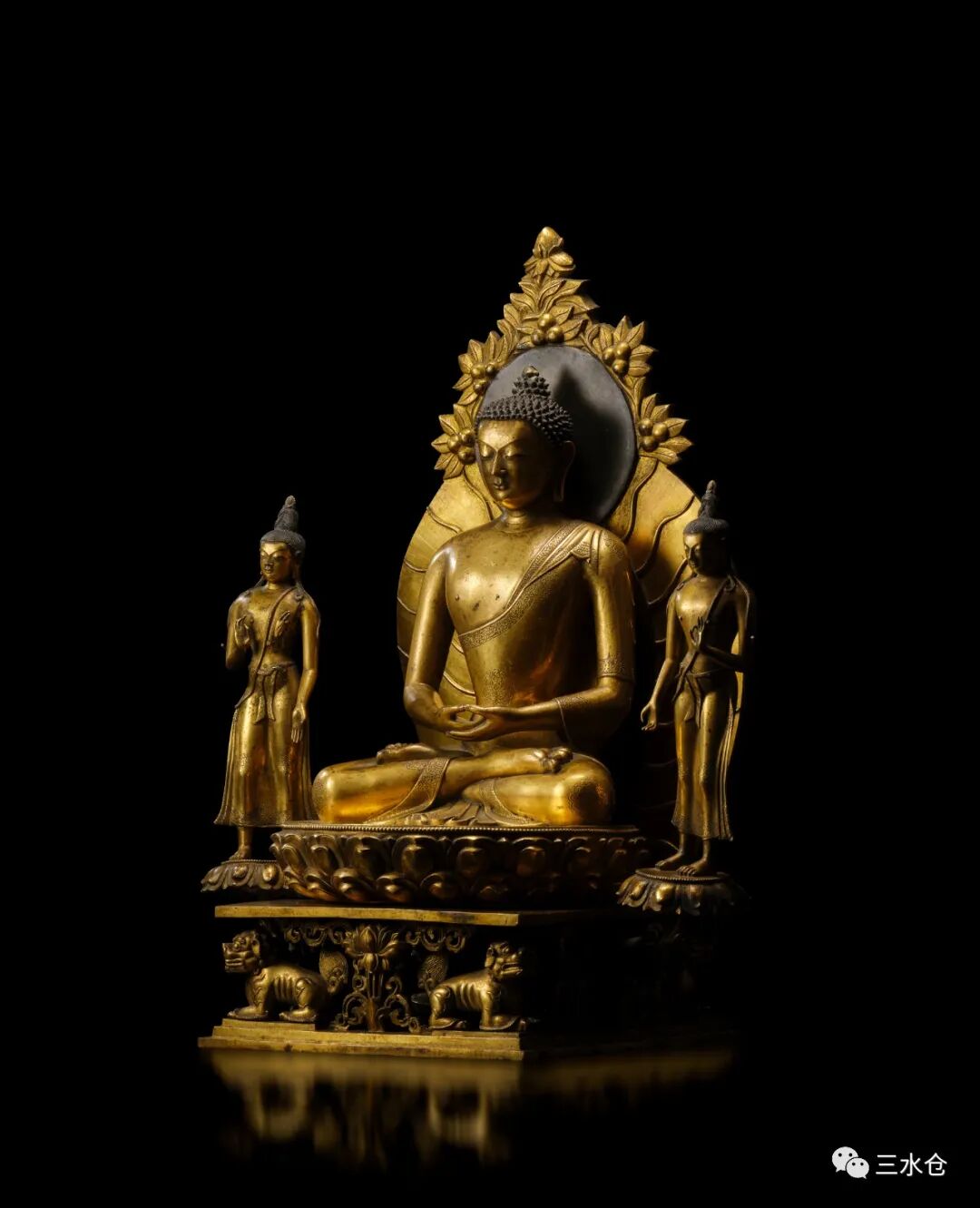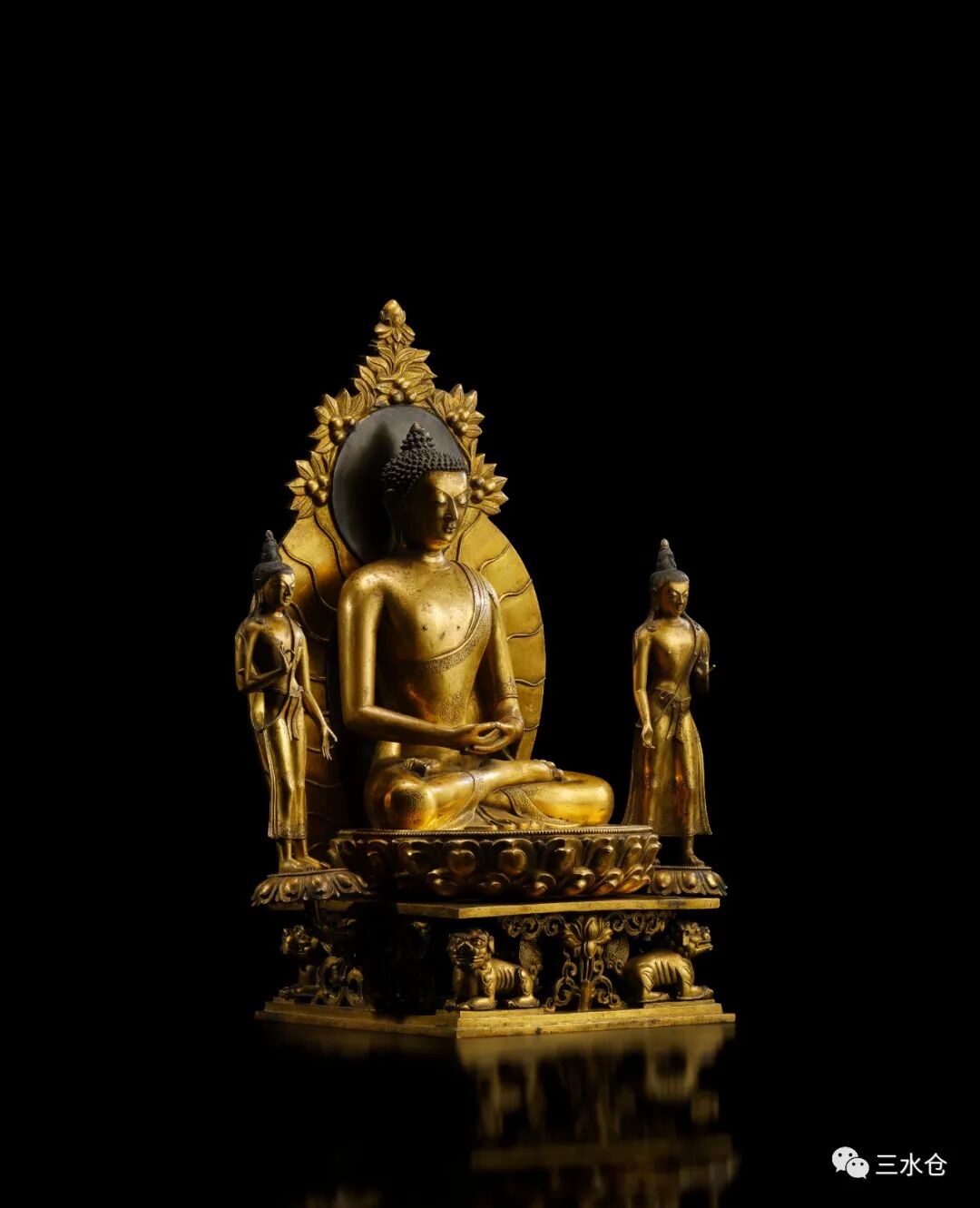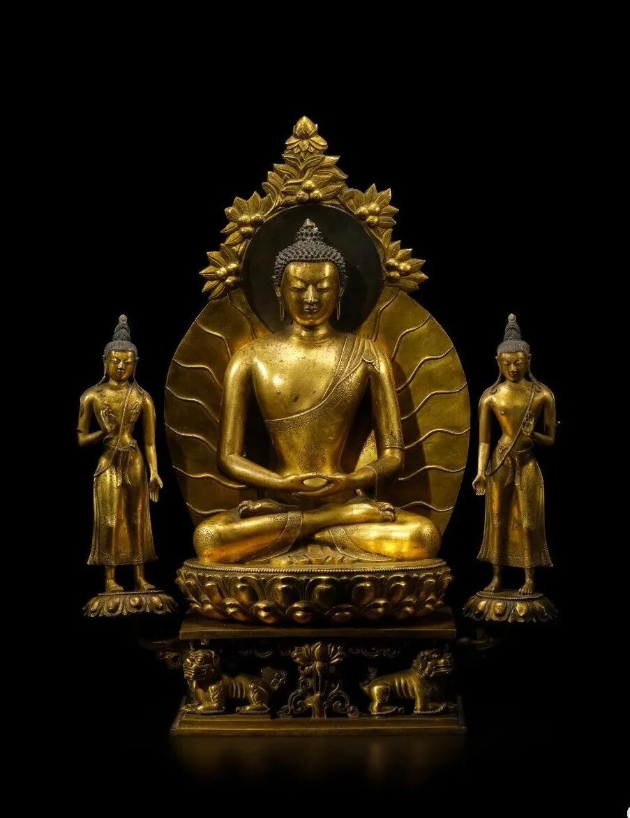 这尊高达43.5厘米,且富有韵律感的造像组合描绘的是的释迦牟尼三尊像,两侧的协侍应该是观世音菩萨和金刚手菩萨。释迦牟尼直身端坐,躯干健壮,两侧的协侍身姿微微扭动,整体线条塑造出如此恰到好处的韵律感。