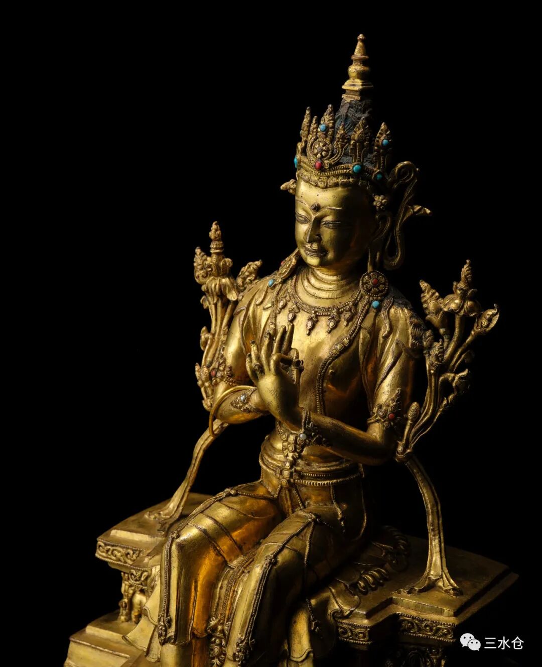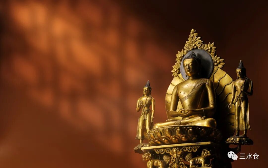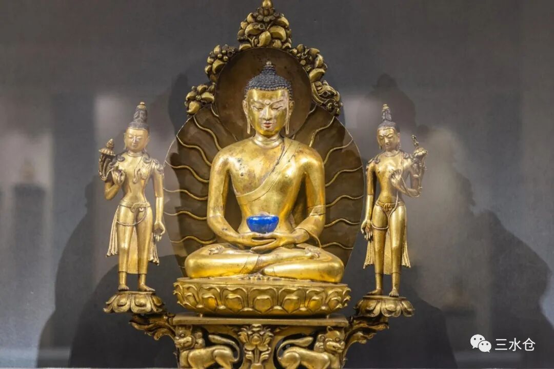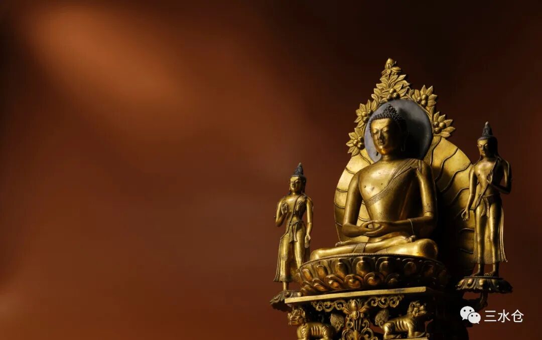 这尊高达43.5厘米,且富有韵律感的造像组合描绘的是的释迦牟尼三尊像,两侧的协侍应该是观世音菩萨和金刚手菩萨。释迦牟尼直身端坐,躯干健壮,两侧的协侍身姿微微扭动,整体线条塑造出如此恰到好处的韵律感。