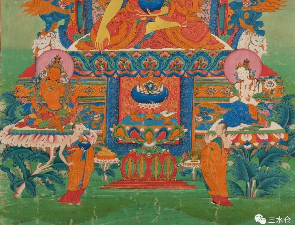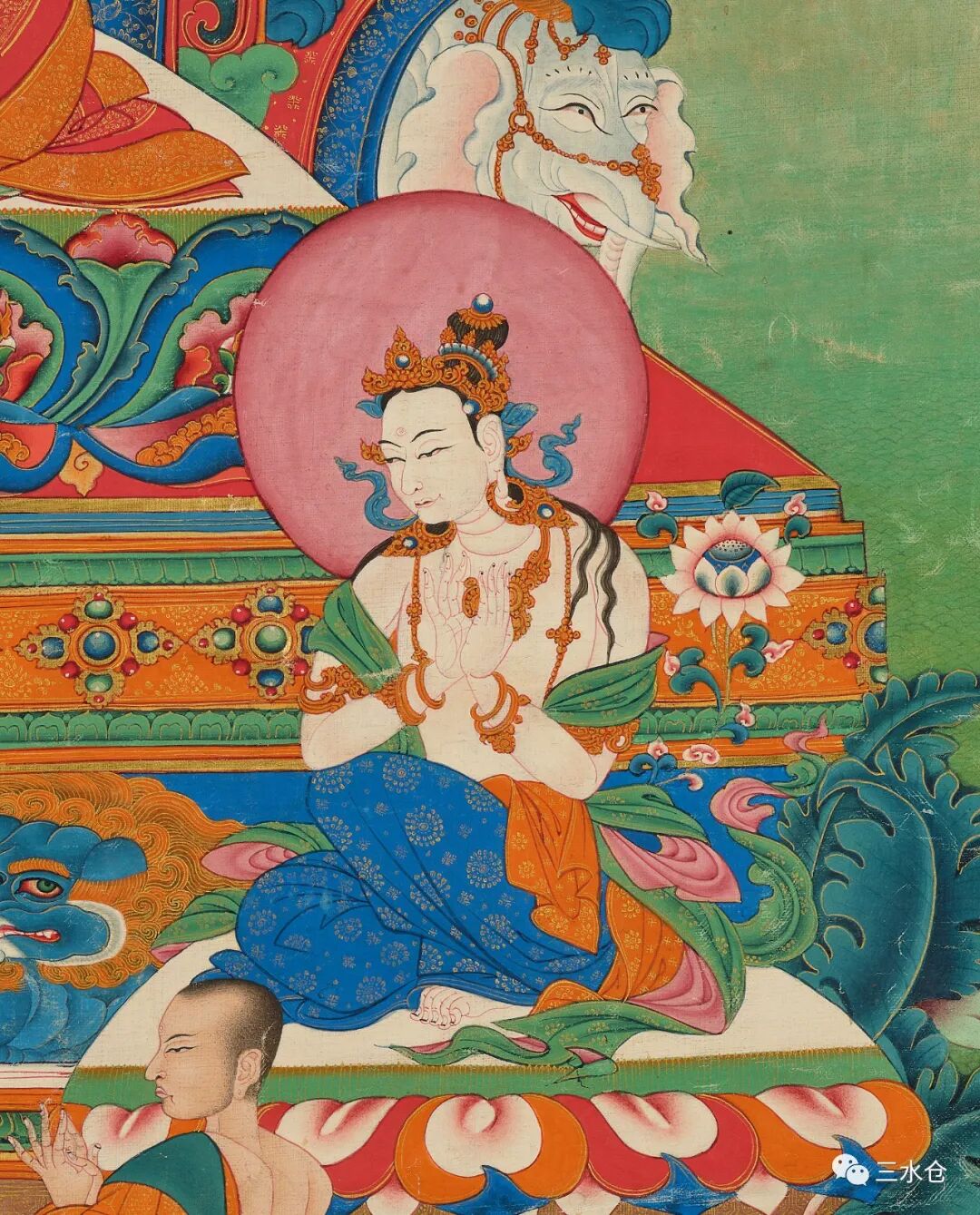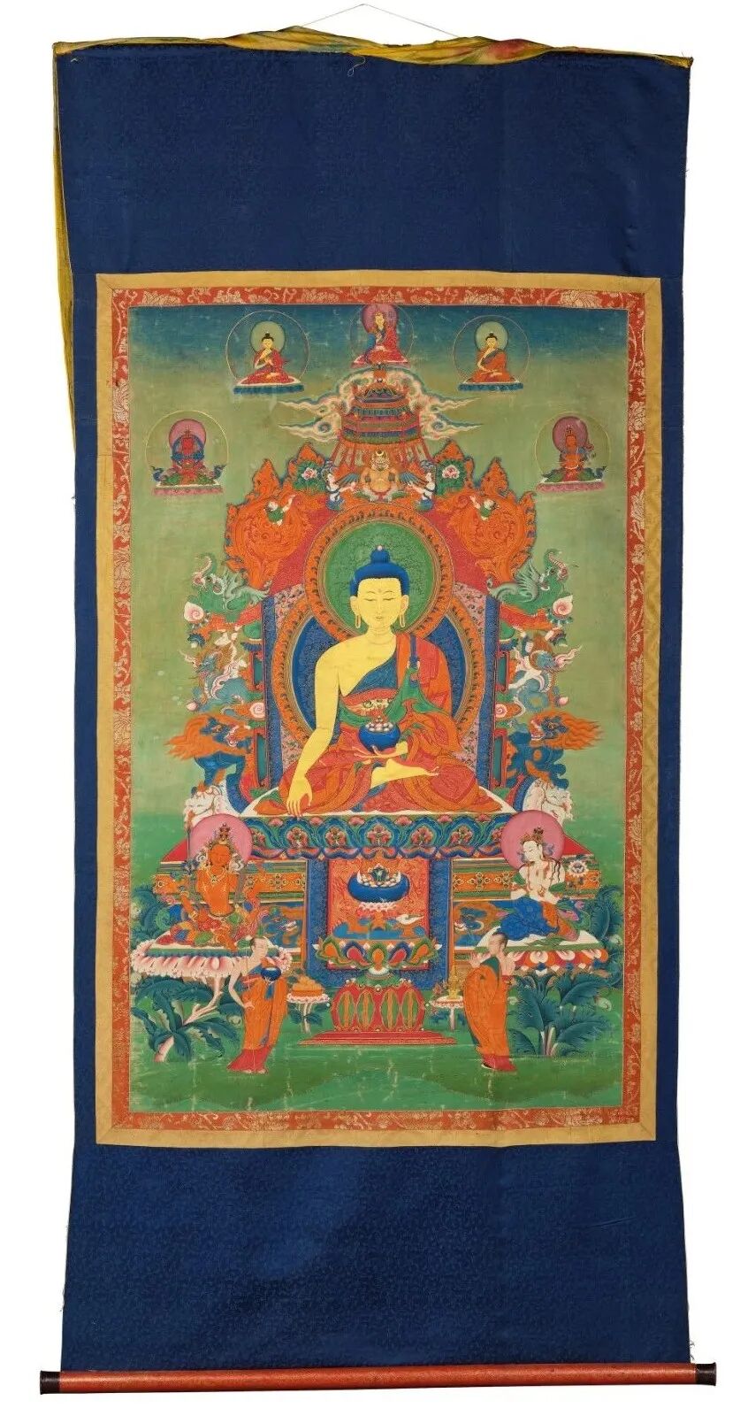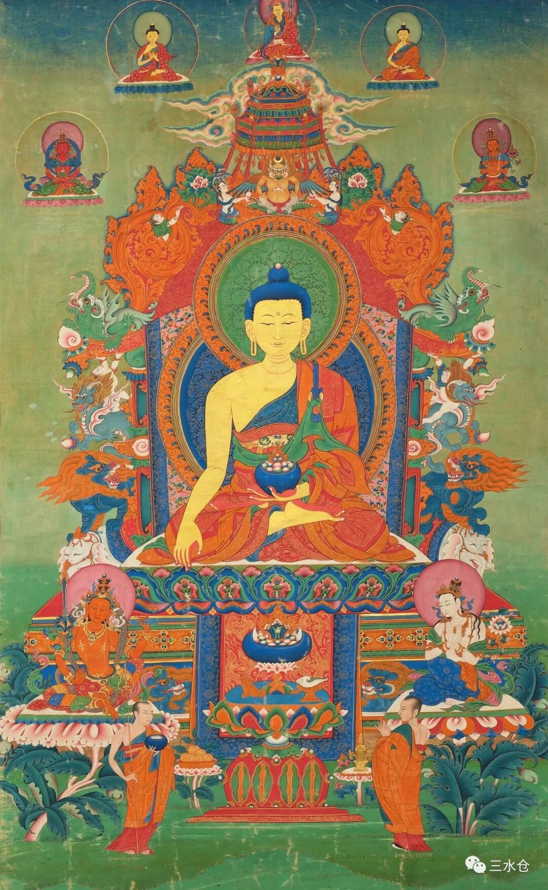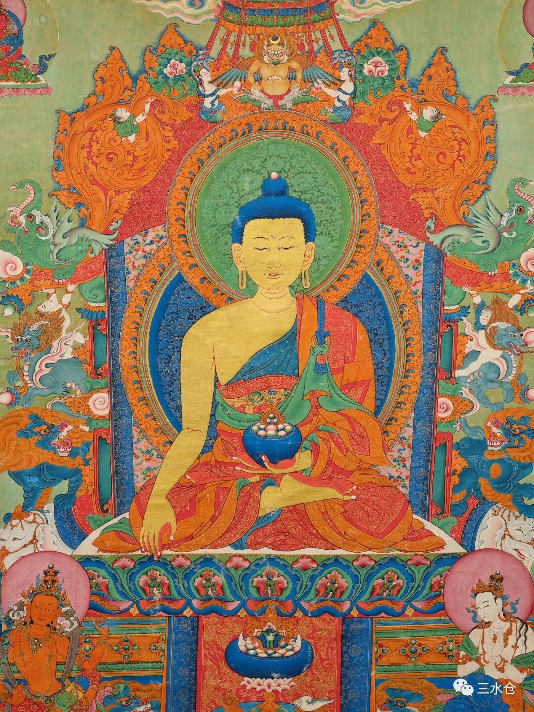 这件非凡的释迦牟尼唐卡作品色彩绚丽,展示出来画师卓越的绘画技以及对色彩强烈的感知,在现存的唐卡作品中更是脱颖而出——细节完美,线条利落,色泽逼人。
