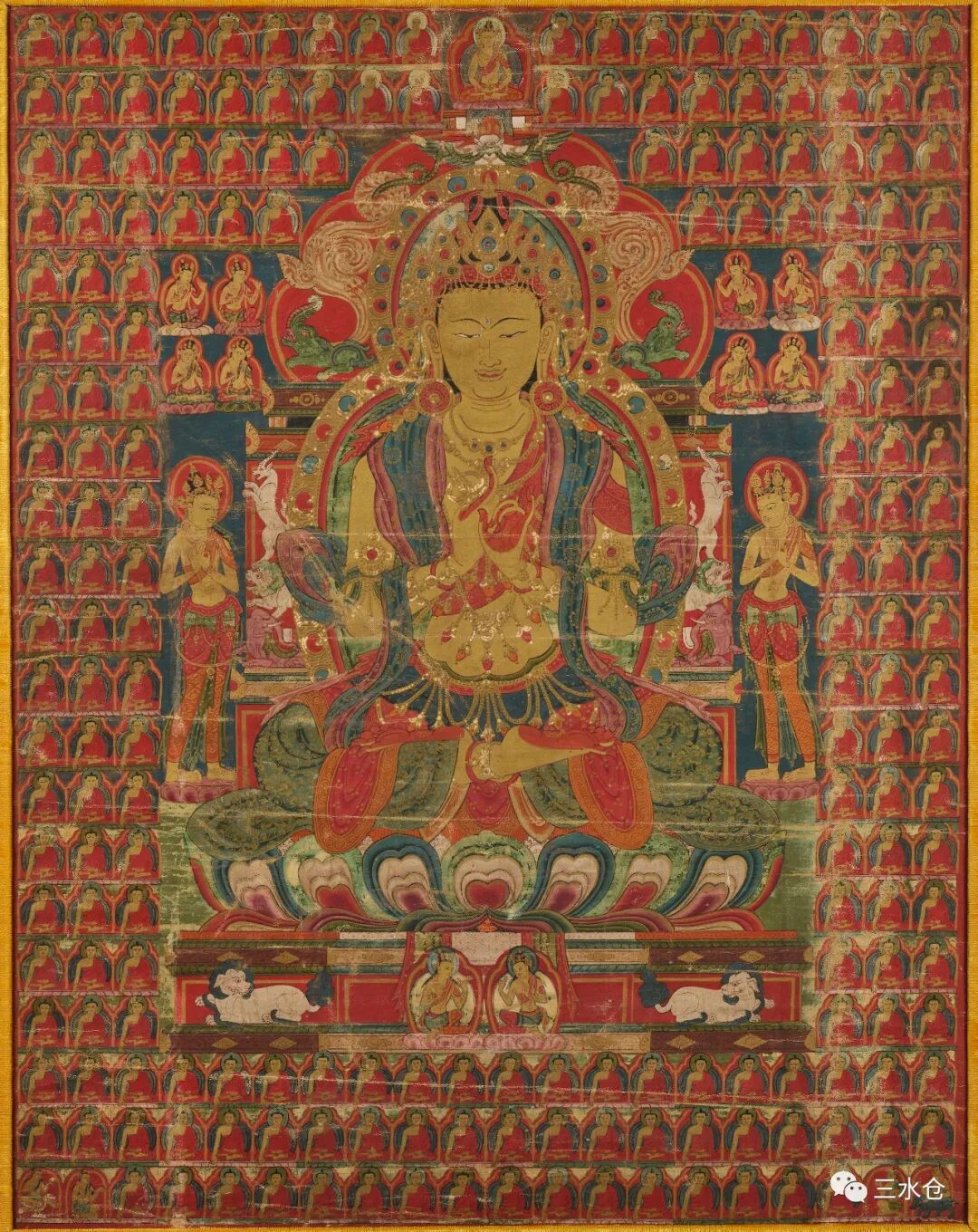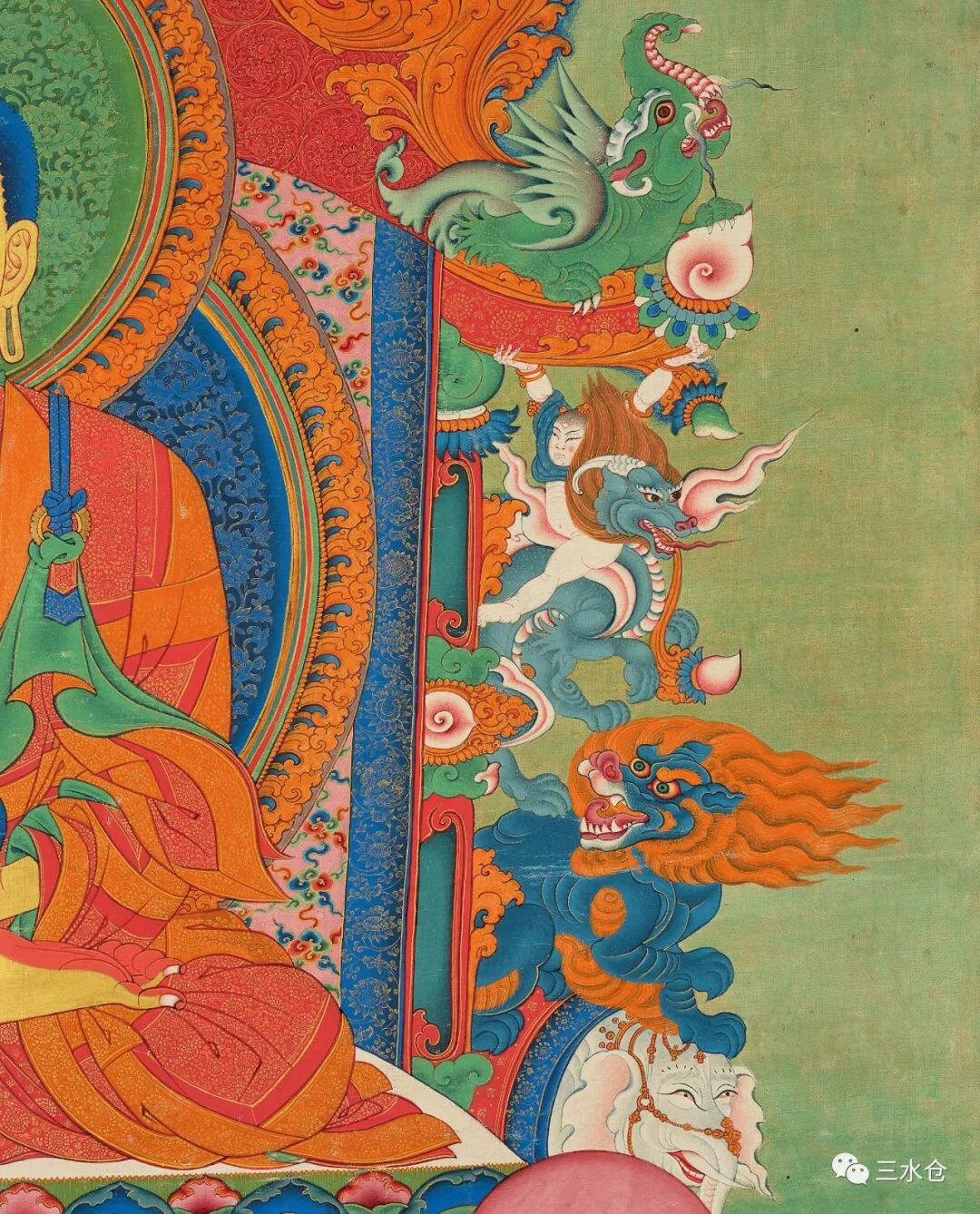 画作中最具魅力的细微差别之一是,佛陀宝座下部一对匍匐在地的狮子。具体来说,他们以近乎温文尔雅的方式吸引观众。这种背离常规的做法表明了这位艺术家的绝对自信,唯一已知的分享这一惊人细节的唐卡是故宫博物院的上述唐卡。