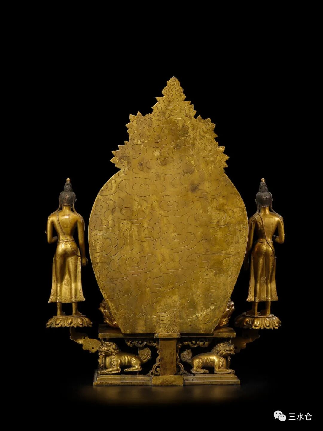 交织着荣光的记忆,这件包含灵感的释迦三尊像,奏出了清王朝与蒙古艺术交响的篇章。也折射出了以藏传佛教为纽带,连接出满蒙之间政治联盟。眼前这件精彩的作品出自清代京城宫廷的鸿篇巨制,然而我们可以明显看出,造像受到了广受赞誉的扎纳巴扎尔艺术风格的影响。