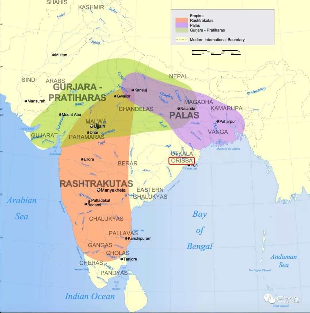 上图中用紫色标记处的地域便是帕拉王朝的疆界:其疆域东起阿萨姆,西界克什米尔,南临文迪耶山,北至喜马拉雅山南麓。