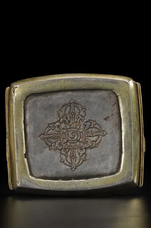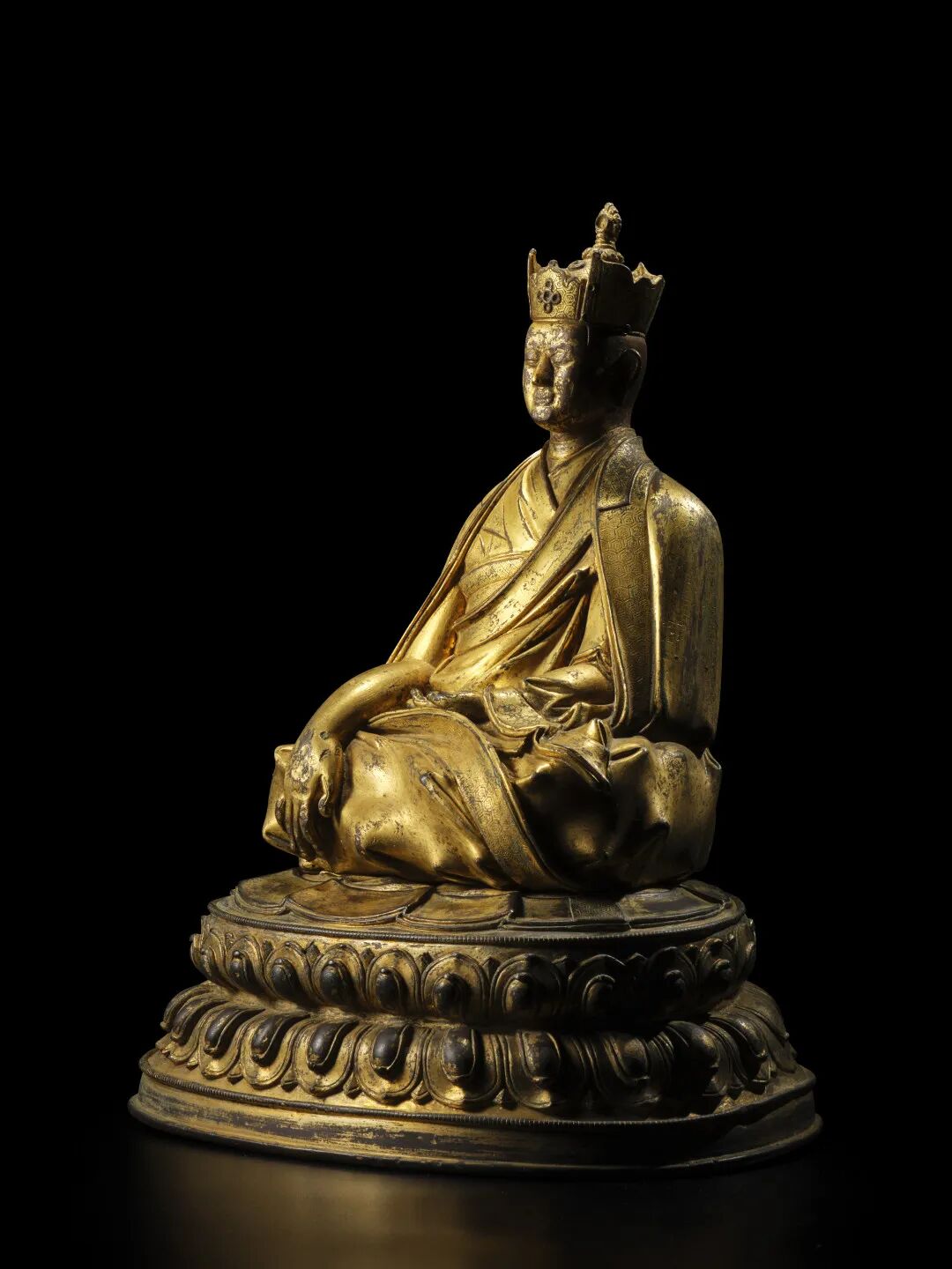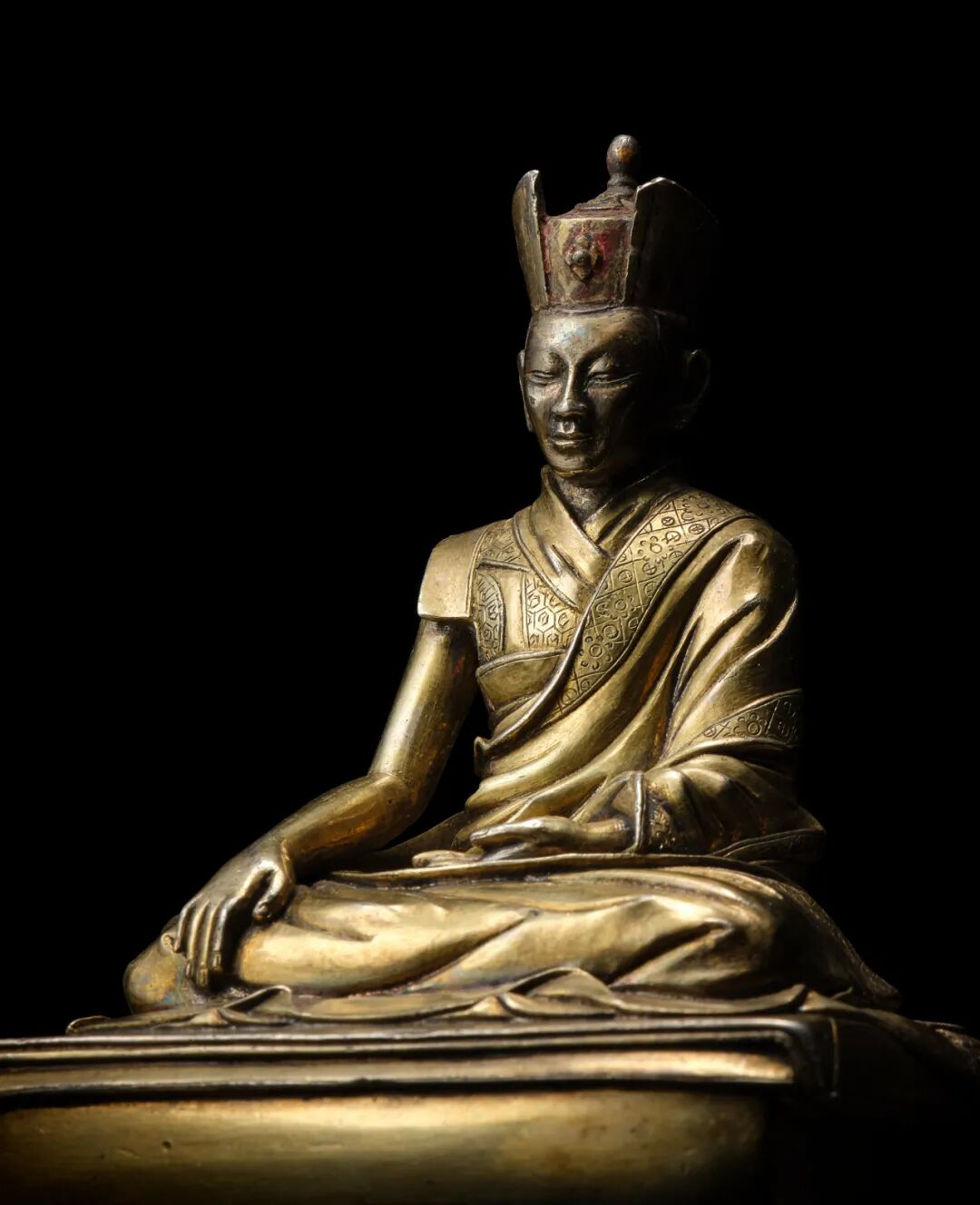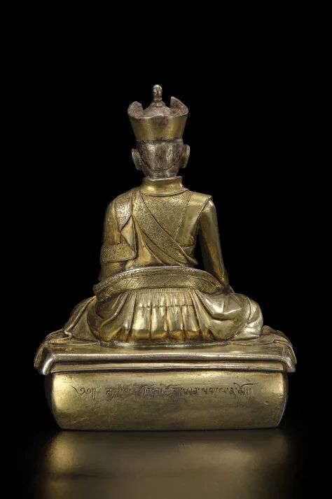 在喜马拉雅造像之中,银珍贵、罕有甚于黄金,故通常仅错于铜像之作画龙点睛之笔。然而此尊造像以银铸造并施以鎏金,更为难得一见,足以彰显供养人显赫的财富与无比的虔诚。五世夏玛巴为噶玛噶举传承中最伟大的上师之一,此尊造像生动传神地刻画其样貌与神态,为其经典形象。造像小巧却足具分量,坎肩及外衣边缘刻画精细图案,于座上堆栈,涌起层层褶皱,颇富厚重庄严之感。