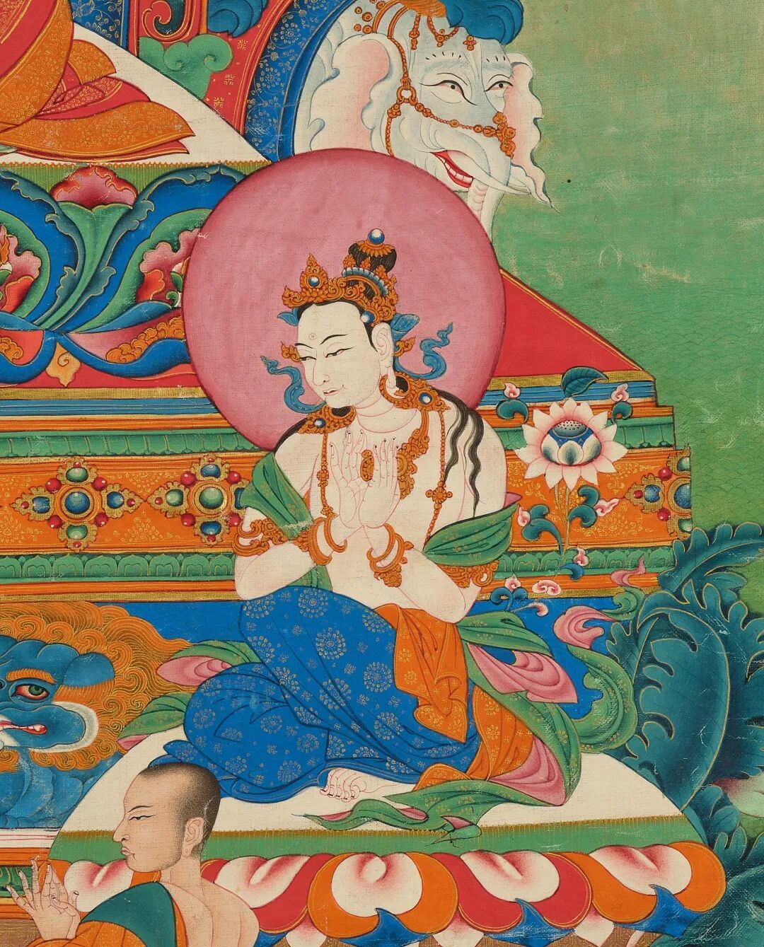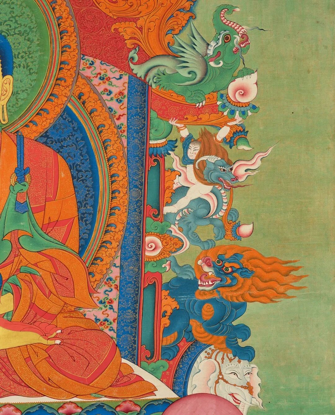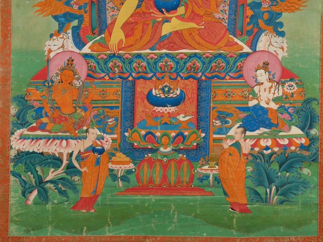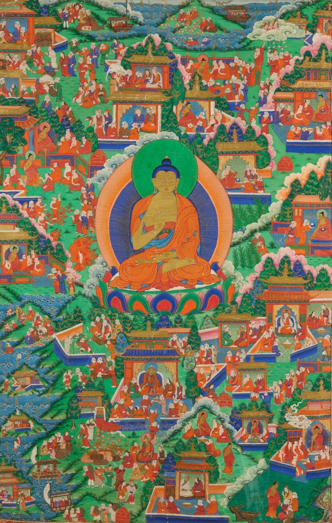 为你亲自导赏本幅珍罕唐卡此幅庄雅而夺目的巨幅释迦牟尼唐卡将辉煌瑰丽的佛教意象与平和淡雅的青绿背景融合,人物上承古典的十五世纪藏中之钦孜风格,山水下应十八世纪其时之藏东八蚌传统,强烈的宗教虔诚与悠远旷达的美学风潮交相辉映,蔚为壮观。唐卡以近乎完美之品相传世,其笔法细腻精湛,细节灵动而优美,于所有时代与流派之唐卡中皆堪称顶级之作。Lot 1027