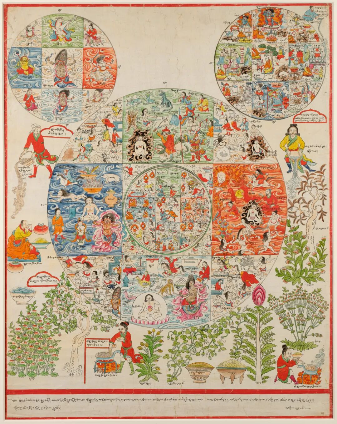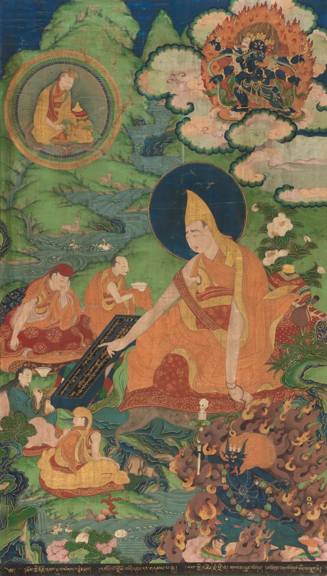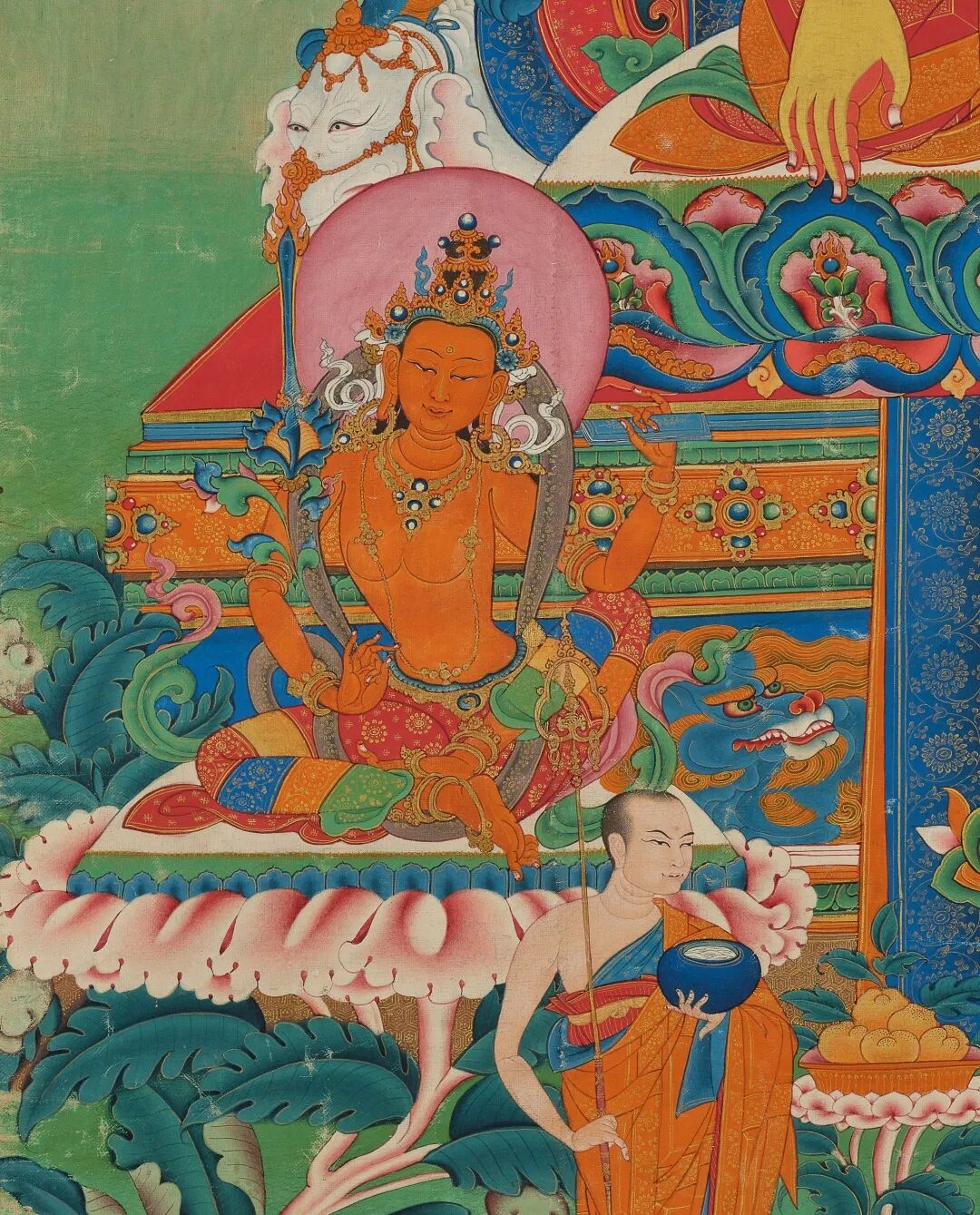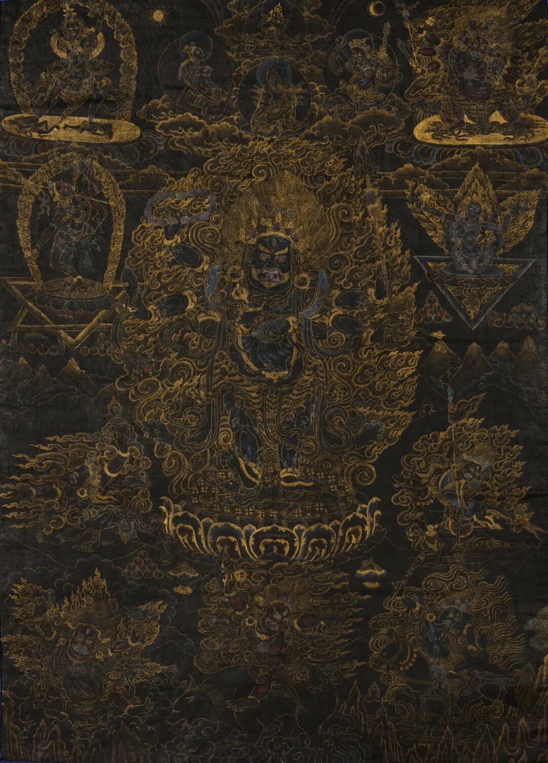 为你亲自导赏本幅珍罕唐卡此幅庄雅而夺目的巨幅释迦牟尼唐卡将辉煌瑰丽的佛教意象与平和淡雅的青绿背景融合,人物上承古典的十五世纪藏中之钦孜风格,山水下应十八世纪其时之藏东八蚌传统,强烈的宗教虔诚与悠远旷达的美学风潮交相辉映,蔚为壮观。唐卡以近乎完美之品相传世,其笔法细腻精湛,细节灵动而优美,于所有时代与流派之唐卡中皆堪称顶级之作。Lot 1027