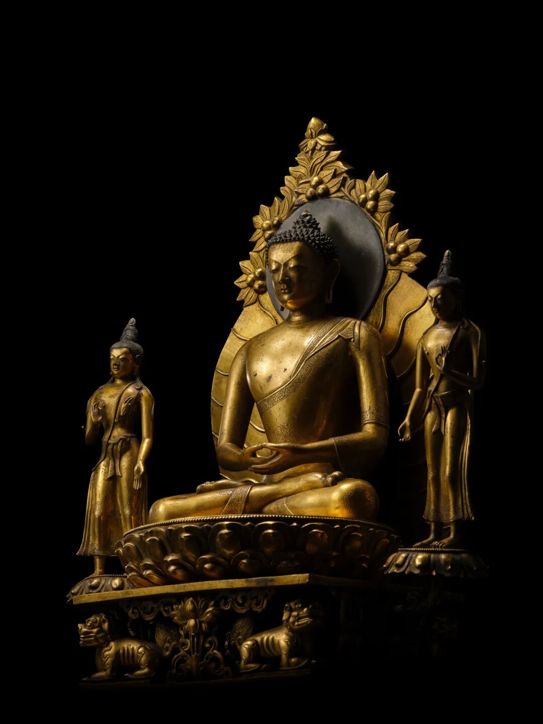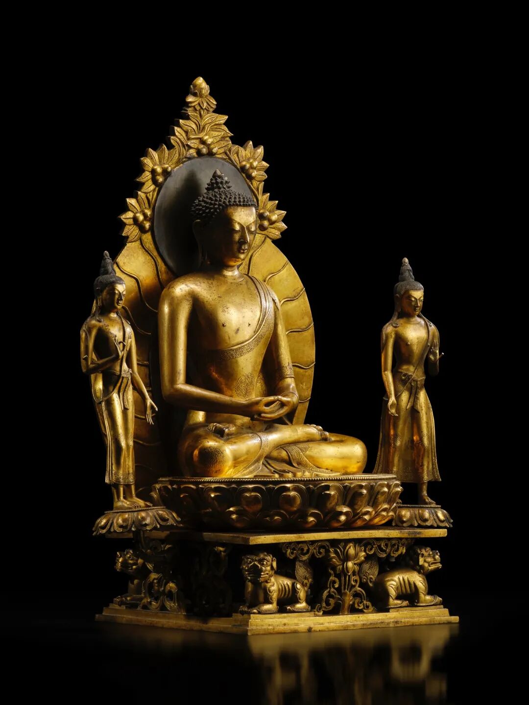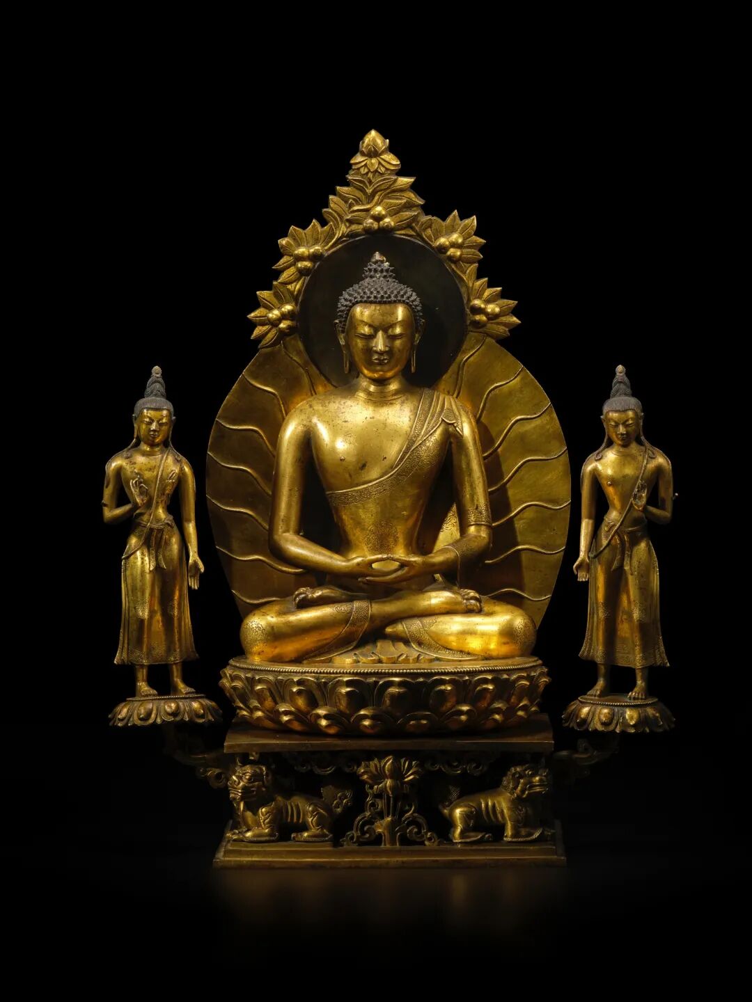 Herholdt Jensen Auctioneer,哥本哈根,1995年此释迦牟尼三尊像具明显的蒙古扎纳巴扎尔风格,亦融合清代宫廷工艺之元素。佛陀身形之流畅潇洒几近完美;其双目微弯,面容年轻而柔和,皆为扎纳巴扎尔风格特征。二菩萨之面容相较之下无疑更富有棱角。造像各部分保持分开铸造之样,佛陀之蒙古身形之上被长衣,刻富丽团花,样式与清代造像一致。此外,莲台上的层层伸展蜿蜒的缠枝莲纹,与清宫瓷器及掐丝珐琅之装饰风格如出一辙。