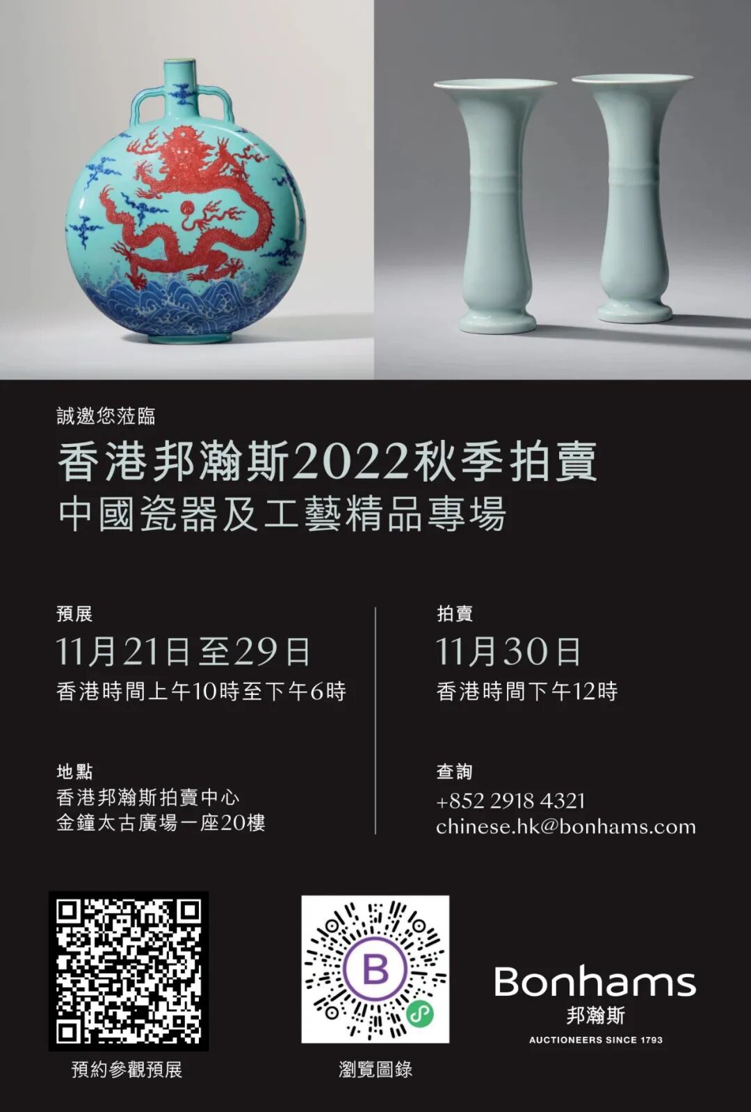 “中国瓷器及工艺精品”及“将进酒—中国饮酌文化与艺术”秋拍专场,将分别于11月30日(后天)中午12时及下午2时先后举槌!除领衔拍品「利德尔」抱月瓶外,部门更精心挑选一系列珍品雅器,琳琅满目。