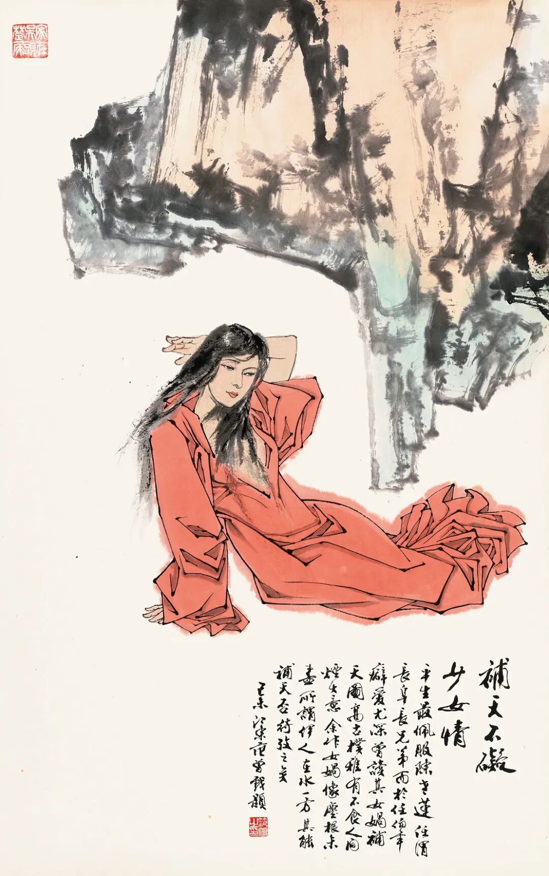 款识:补天石礙少女情。平生最佩服陈老莲、任渭长、阜长兄弟,而于任伯年癖爱尤深。曾读其《女娲补天图》,高古、朴雅,有不食人间烟火意。余作《女娲像》尘根未尽,所谓伊人在水一方,其能补天否,待考之矣。己未江东范曾戏题。