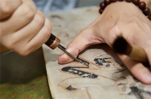雕版与传统木版雕刻并无区别。将勾描在雁皮纸上的版样正面粘贴到加工好的木版上,待版样快干时,搓去多余的纸,将版样上墨迹清晰呈现出来,即可以刀代笔,进行雕刻。