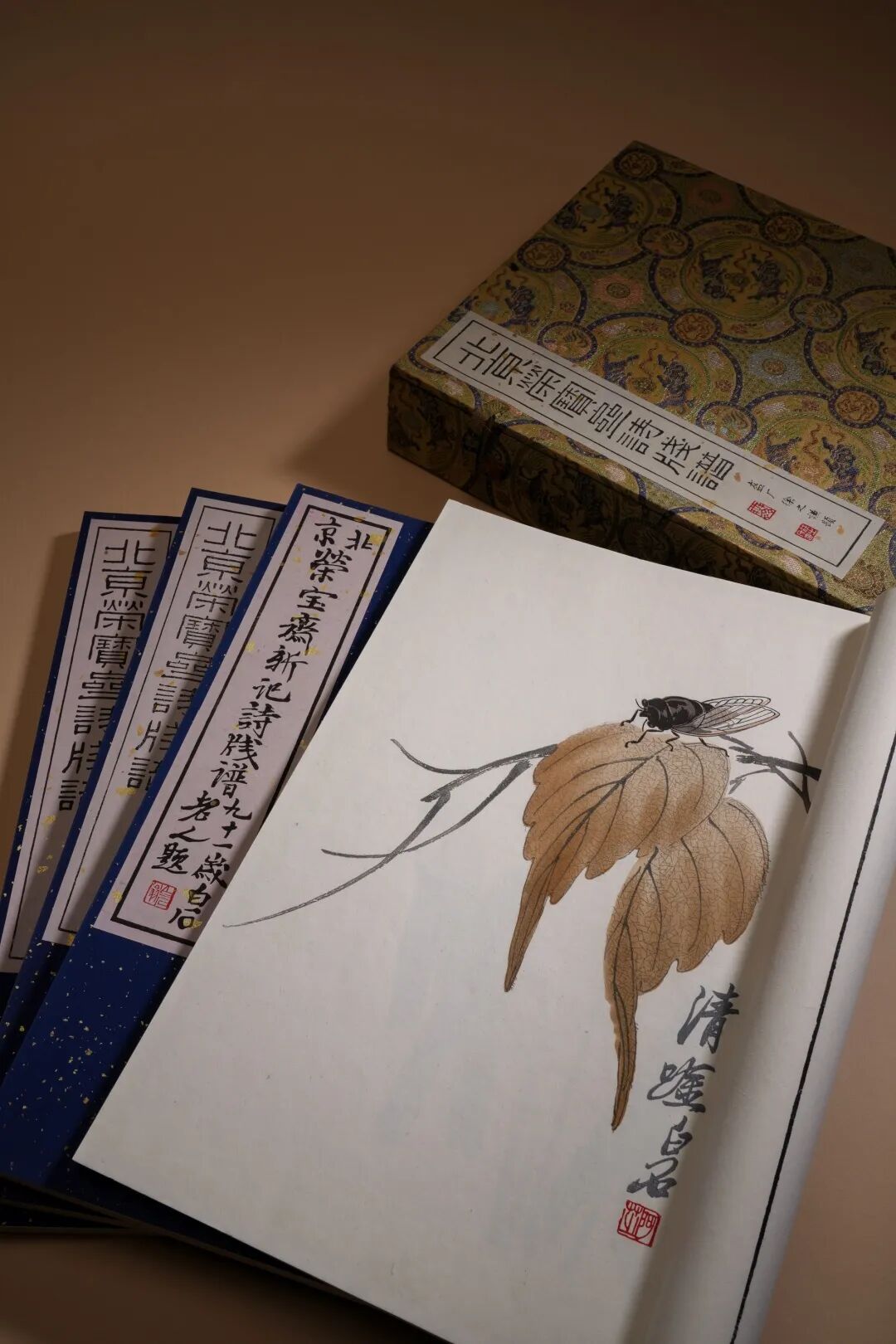 是册收录黄宾虹、傅抱石、关山月、齐白石等诸家名作百幅,刊刻套印之精,与原画难分伯仲。原装织锦函套,装帧精良,刻印精绝,用色妍雅,为赏家所称颂。