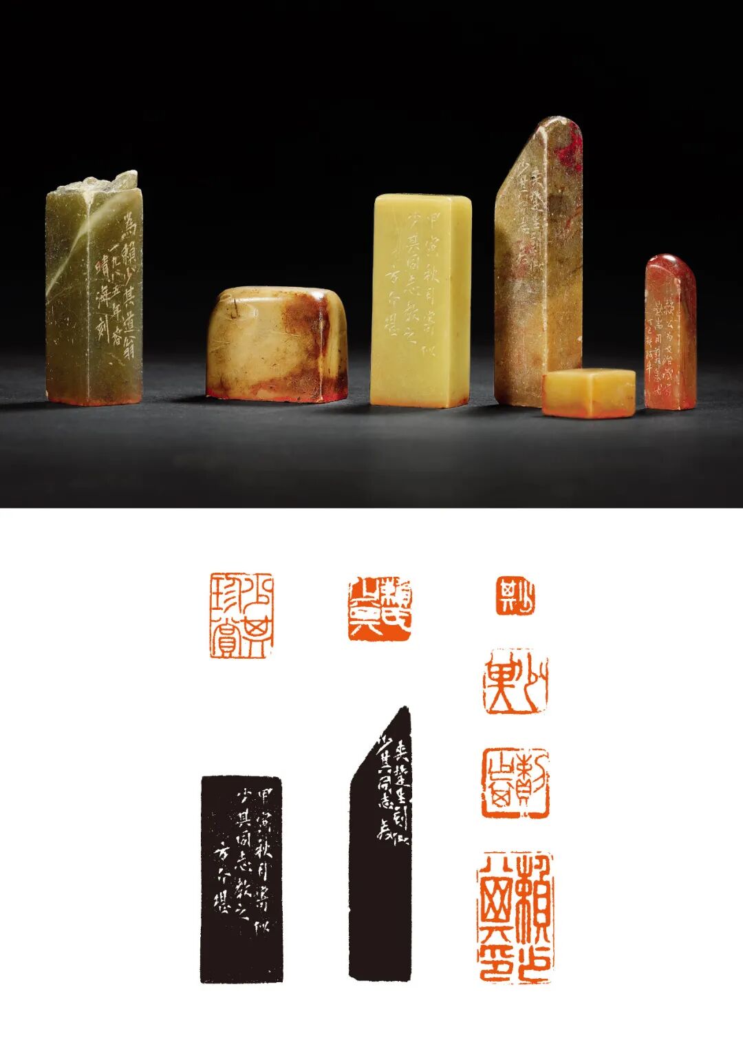 边款:1.祝古稀记念,东京书画个展。为赖少其道翁,一九八五年春晴海刻。3.甲寅秋月寄似少其同志教之,方介堪。4.来楚生刻似少其同志教。6.赖公为文治藏翁题端,用剪急就,丁巳秋阿牛。