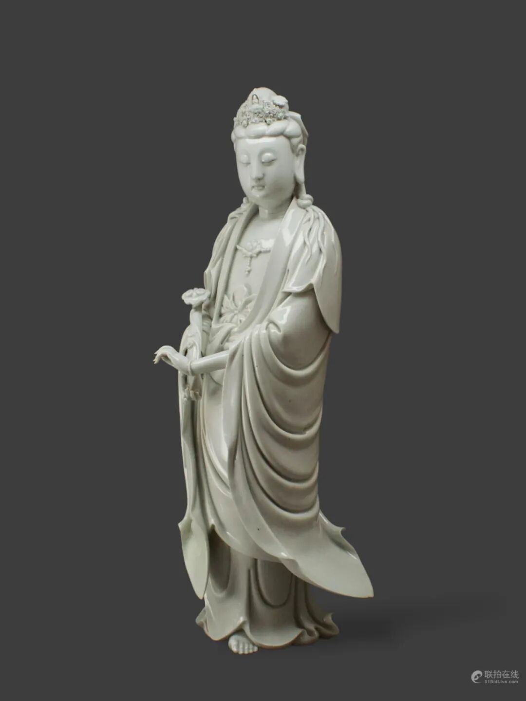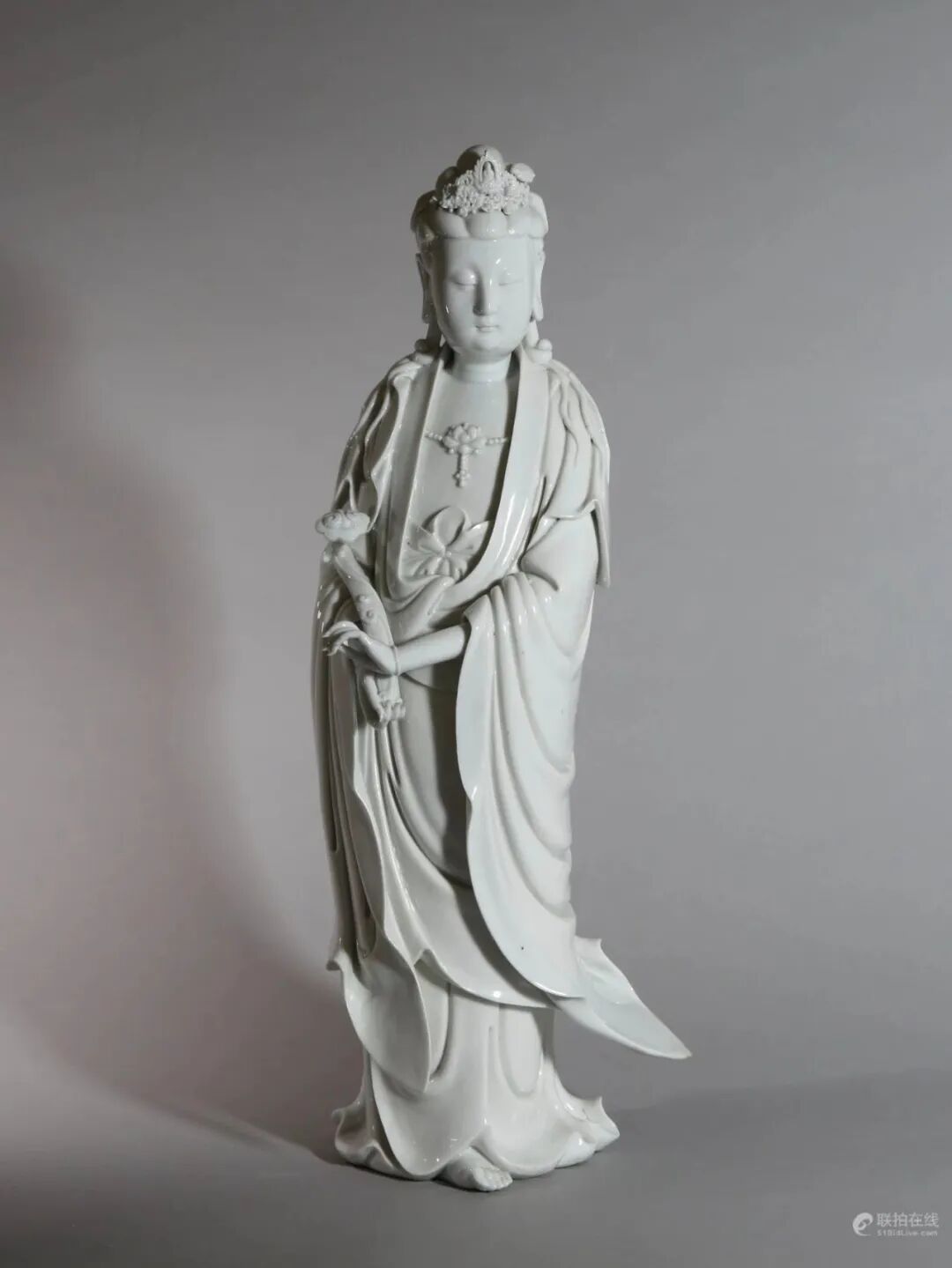 观音盘髻,双目微合,脸带微笑,肩披帔帛,颈佩璎珞,衣褶自然流畅。白胎,胎骨细腻厚重。通体施白釉,釉面匀净润泽,座跟露胎。背钤阳文篆书「博及渔人」方章。苏学金(1869一1919)是清末最为著名的的话瓷雕艺术家之一,「博及渔人」为其印章款。参阅厦门博物馆收藏的由其创作的观音像。另见,《白瓷:珍贵的瓷器图片资料》,68-71,第117至120页,及《S. Marchant & Son六十周年白瓷展览》1985年12月,第52号,第29页。