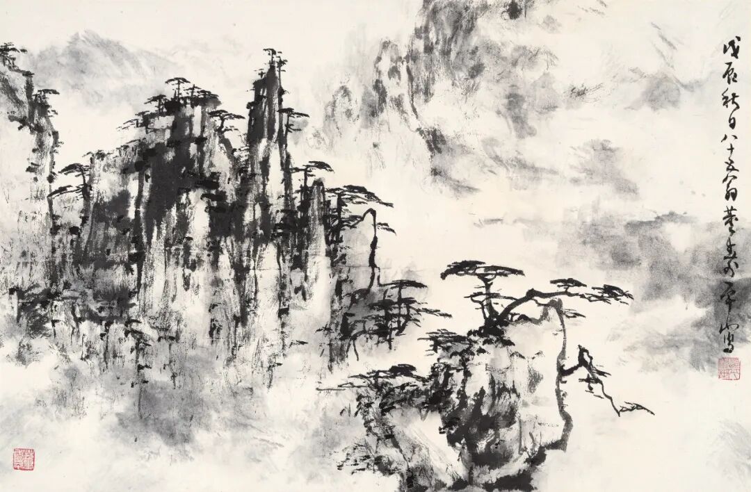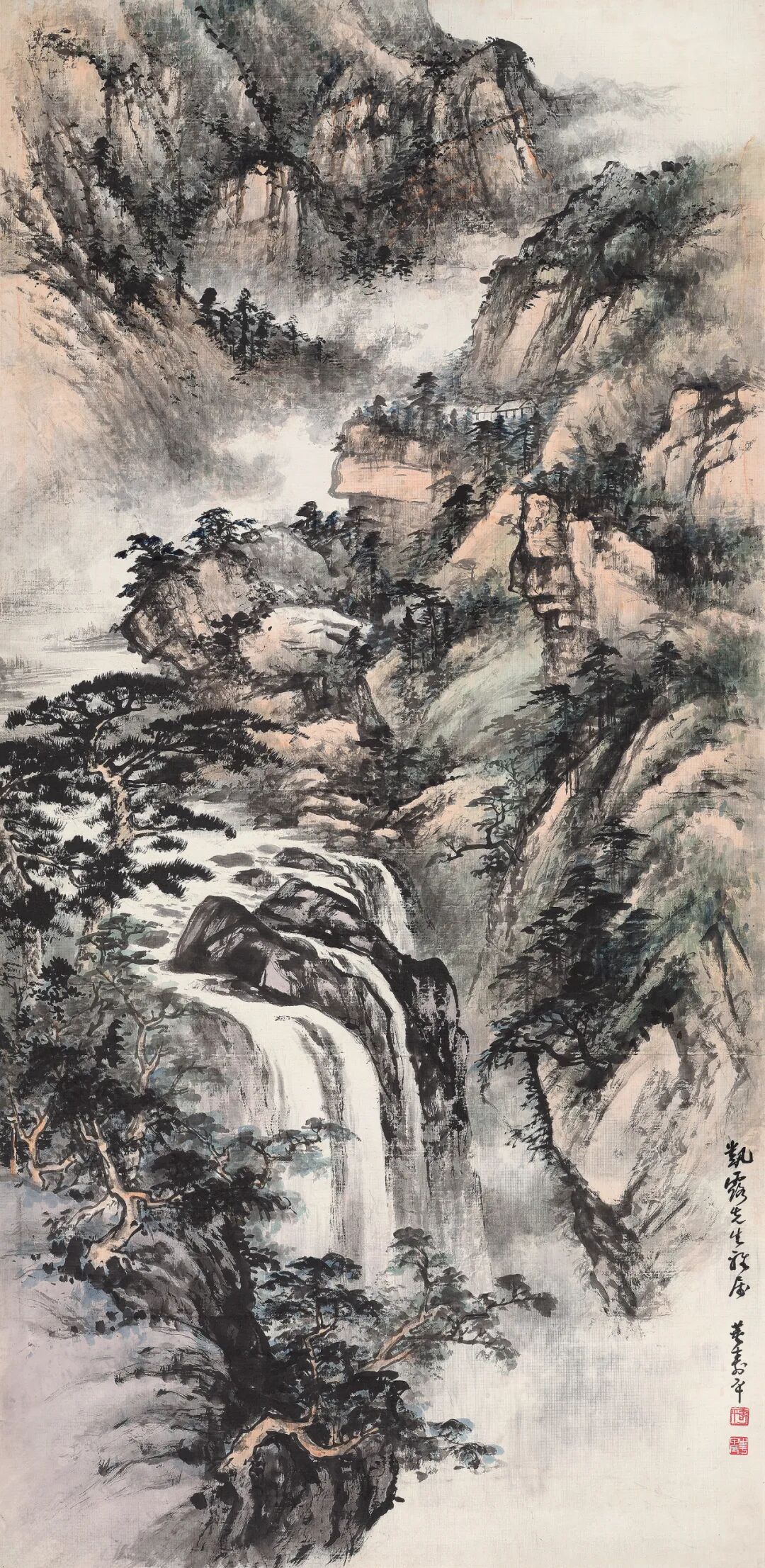 以“黄山巨擘”之名享誉海内外的董寿平,于黄山亦情有独钟。董氏结缘黄山,约始于1954年赴黄山写生;其后其山水画便几乎纯以黄山为师,不仅体贴其物象,笔下所画多以奇峰、虬松、云海为描摹对象,更状其精神,做到整体气韵的统一。写赠黄凯禄之《春山松瀑》即堪称典型,此幅用色沉着、清雅含蓄,画中的景色层次分明,有深度,有分量,气韵生动。近景以松石为主,浓墨下笔,准确、老辣,极富力度,中景于烟风云雾当中,群山若隐若现,意象迷离,远景用淡墨所绘,烟云氤氲,虚而不空,整幅作品在云与山接与未接之处留白,画面暗含绵延无尽之意蕴。画面经营位置上计白当黑、虚实结合,前景实,中景虚,给人以一种空灵、伟峻、超脱、高古的艺术感染力,匠心独具。