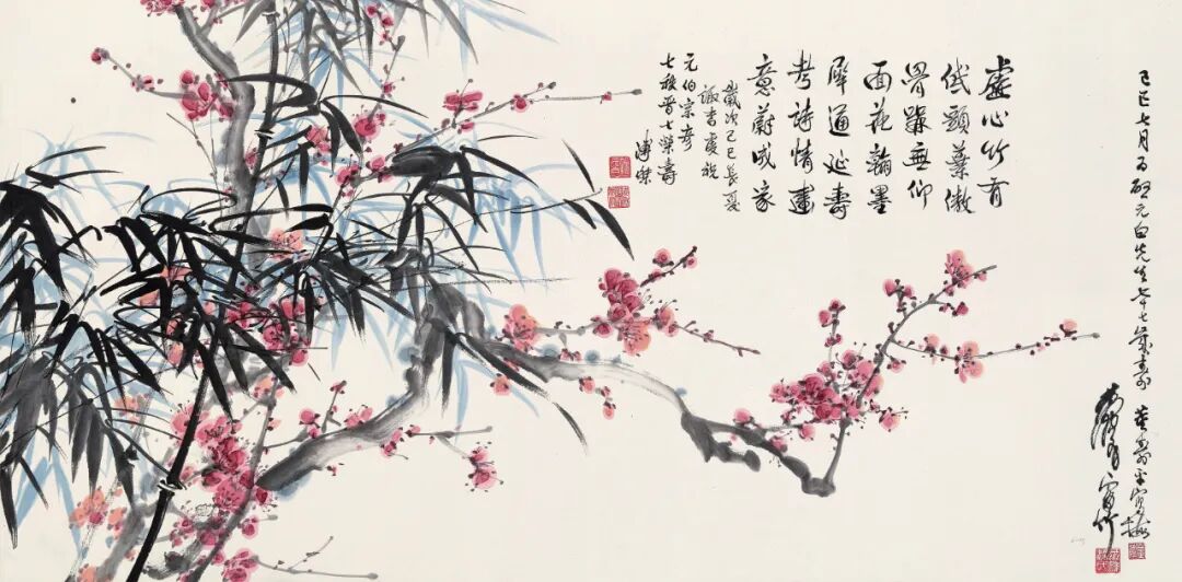 2.1989年7月1日众多书画名家齐聚北京朝阳日坛公园中国艺苑,庆祝启功先生77岁寿辰,此件即为当时所作。董寿平写梅、黄胄写竹、溥杰题字。其中溥杰题字称启功为“元白宗彦”,另见溥雪斋亦称先生“宗彦”。“宗彦”即宗族中有才学之人,可见启先生在宗族之地位和关系。
