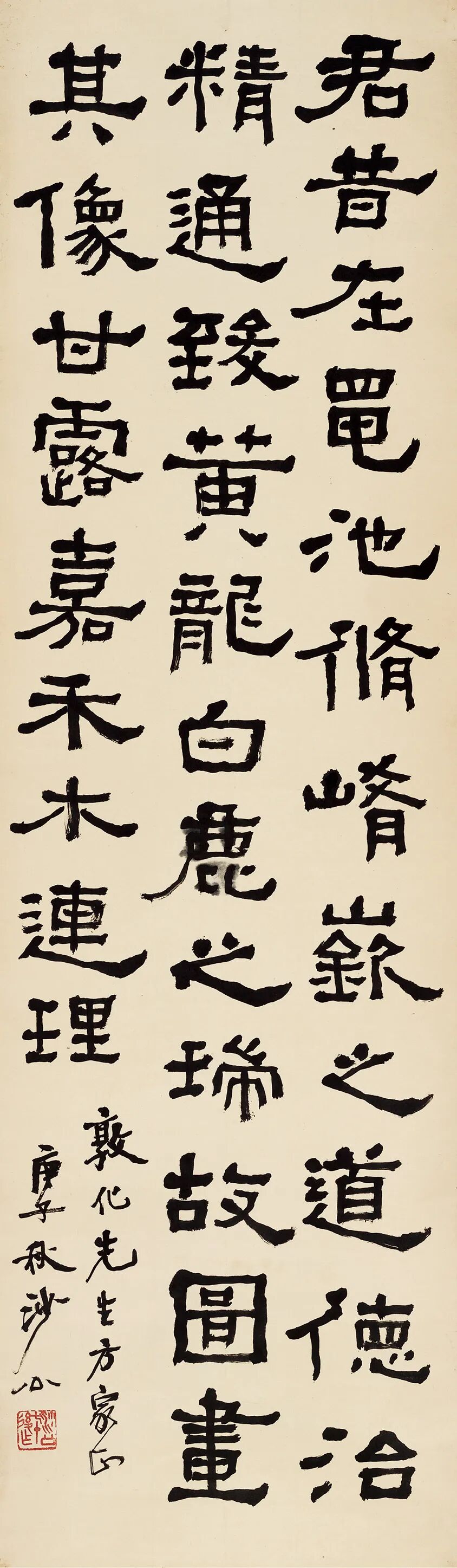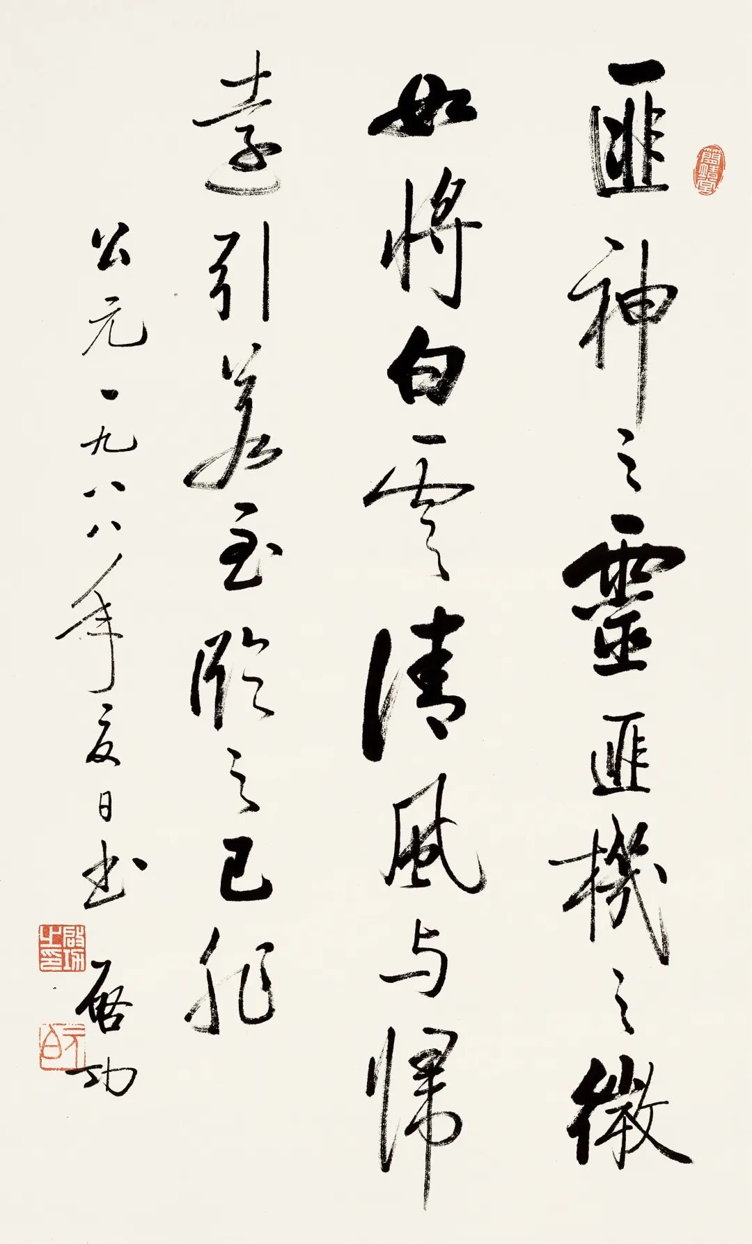 款识:匪神之灵,匪机之微。如将白云,清风与归。远引若至,临之已非。公元一九八八年夏日书,启功。