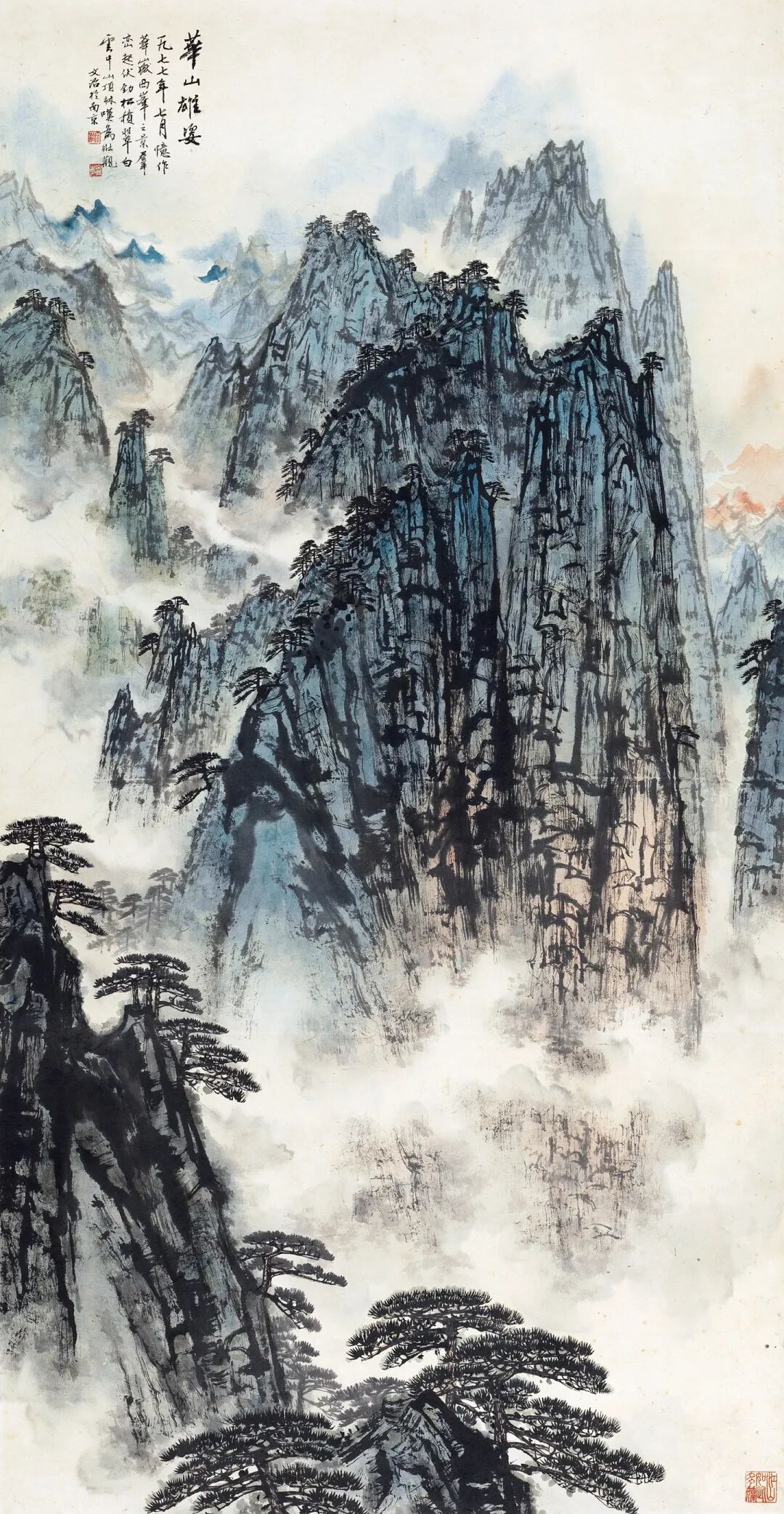款识:华山雄姿,一九七七年七月,忆作华岳西峰之景,群峦起伏,劲松积翠,白云中,山顶林,叹为壮观,文治于南京。