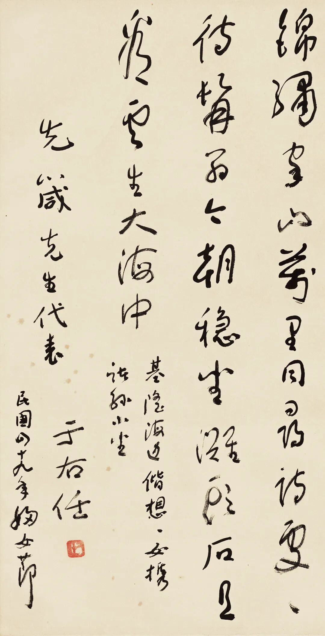 2.此件与本专场号第29拍品:于右任 行书 自作诗《基隆海边小坐》为同一上款人。