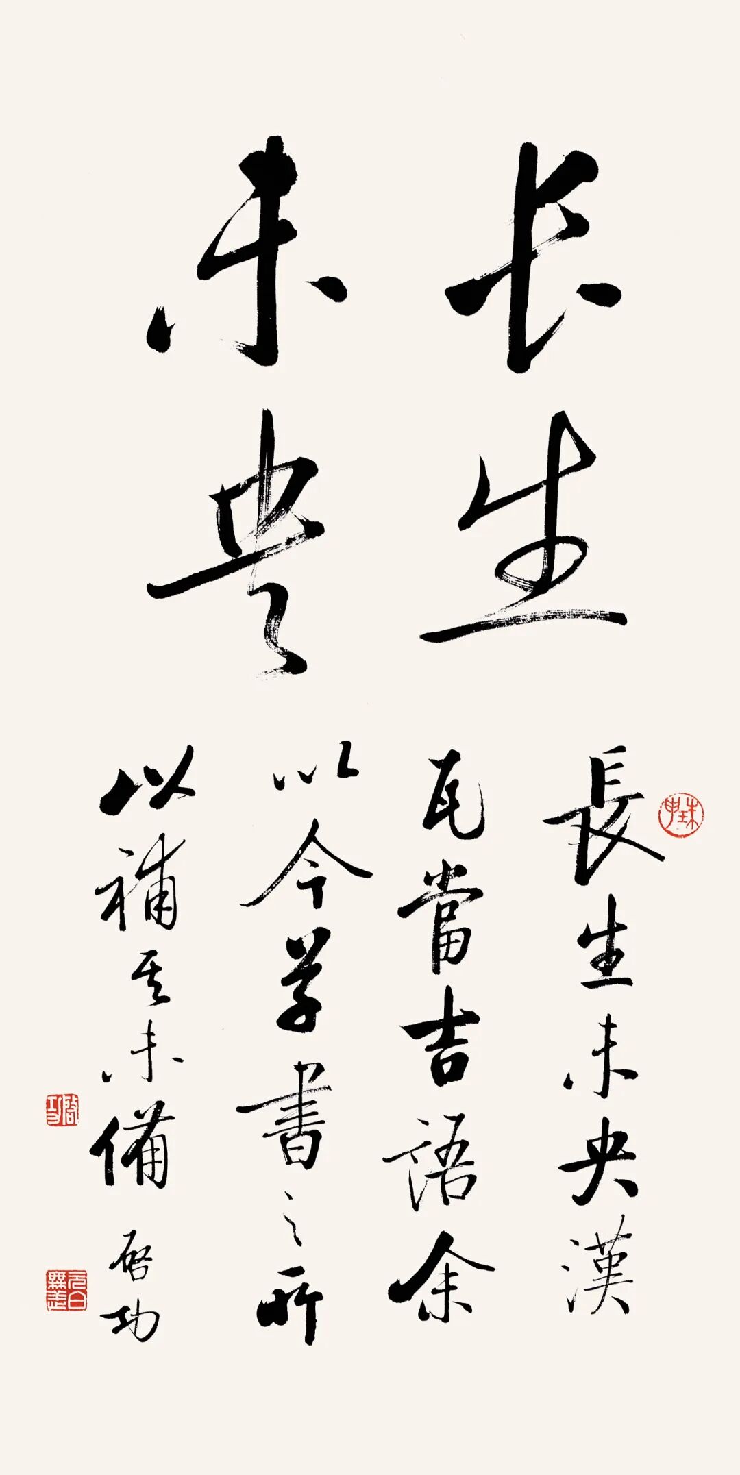 款识:长生未央,汉瓦当吉语。余以今草书之所以补其未备,启功。