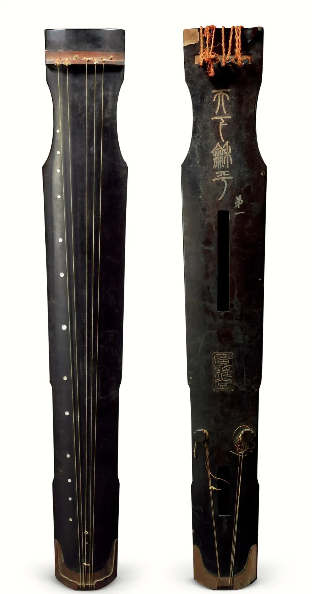 中国嘉德2020春拍“丝桐金声—名家藏珍古琴萃选专场”获展张之洞所斫百琴之首床“天下和平”,其下行书刻“第一”。龙池内两旁刻行书款并填朱砂21字:“光绪庚寅律中黄钟之宫,无竞居士选材命工依法制”。通长121.5厘米,肩宽18.5厘米,尾宽13.5厘米。此琴由张之洞曾孙张遵骝(1916-1992,专攻思想史与佛教史)赠送给戏曲家、翻译家吴晓铃(1914-1995)。(见图6)![]()