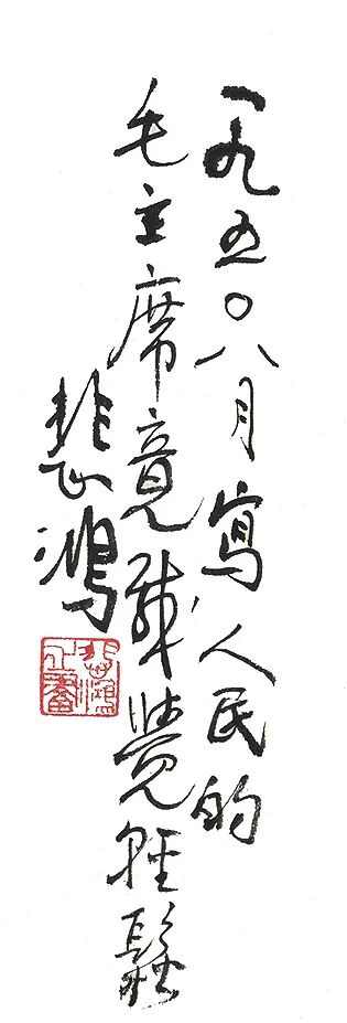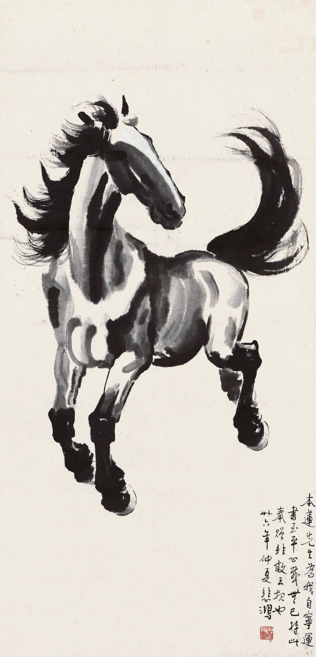 画之目的:日「惟妙惟肖」。妙属于美,肖属于艺。故作物必须凭实写,乃能惟肖。待心手相应之时,或无须凭实写,而下笔未尝违背真实景象,易以浑和生动逸雅之神致,而构成造化,偶然一现之新景象,乃至惟妙。【题识】本莲先生为我自宁运书至平,心感无已,持此奉赠,非敢云报也。卅六年仲夏,悲鸿。【展览】「中国近现代书画十二大名家精品展」,保利艺术博物馆,2011年。1.《徐悲鸿作品集(续二)》图版31,文物出版社,2011年。2.《中国近现代书画十二大名家精品集(二)》第150页,保利艺术博物馆,2011年。【说明】上款人胡本莲,原为青军整编二○六师人事科长,因其帮徐悲鸿运书从南京到北平,悲鸿作此答谢他。依旧的奔马,依旧的腾空跃起,依旧洋溢着勃发的豪情。虽然没有任何近景,但使人感觉到一匹骏马奔驰在广阔无垠的天地间,无拘无束,无往不前,令观者之精神备受鼓舞。