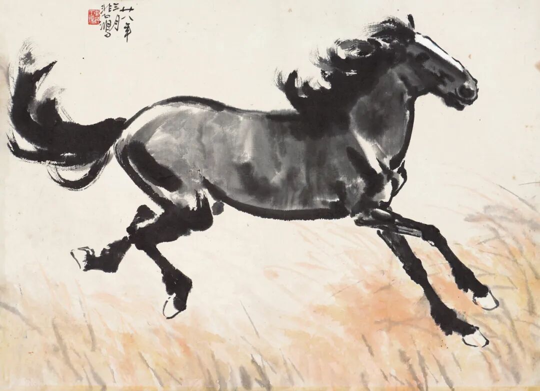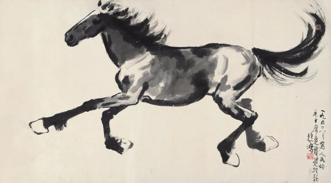 徐悲鸿《驰骋天地间》画作署款“廿八年三月”,即表示本幅完成于1939年4月下旬至5月中旬左右这一段时间,为画家在新加坡维多利亚纪念堂个人筹赈画展结束后所绘。画作为横幅构图,精心描绘了一个生动画面:凌冽秋风吹拂着草木纷披,沙沙作响,一匹骏马紧绷身躯,昂首扬尾,四蹄腾空,正在驰骋向前飞奔,激烈迅猛之势,头颈鬃毛、马尾乘势飞动。大胆的笔墨使用,晕染控制恰到好处,体现骨骼肌肉的内部准确结构,营造出线条与块面的强烈视觉对比,巧妙的留白处理(马额处使用白色颜料更是独创)显示出类似西方光影效果,真正达到画家所谓的“浑和生动逸雅之神致”。