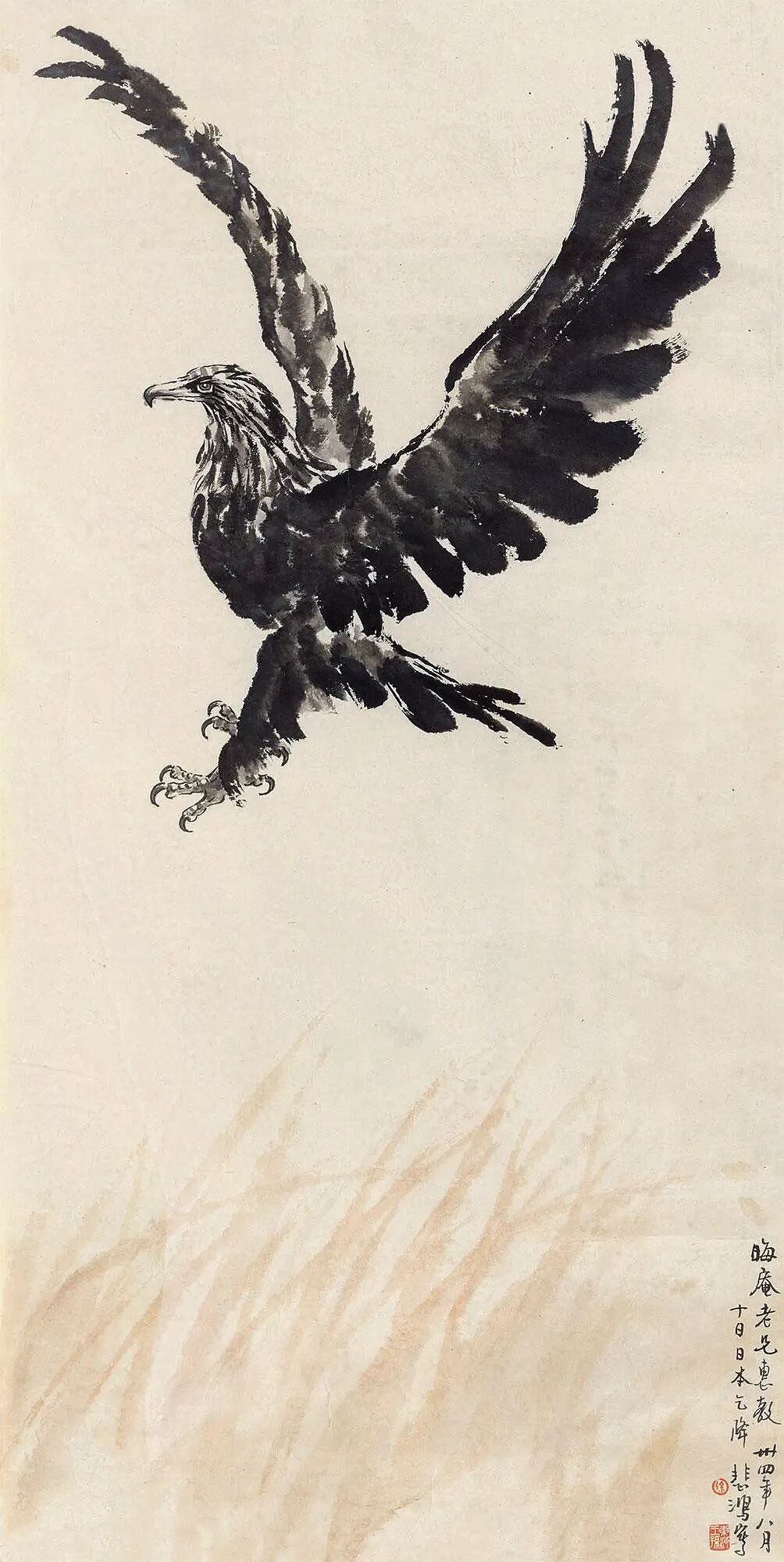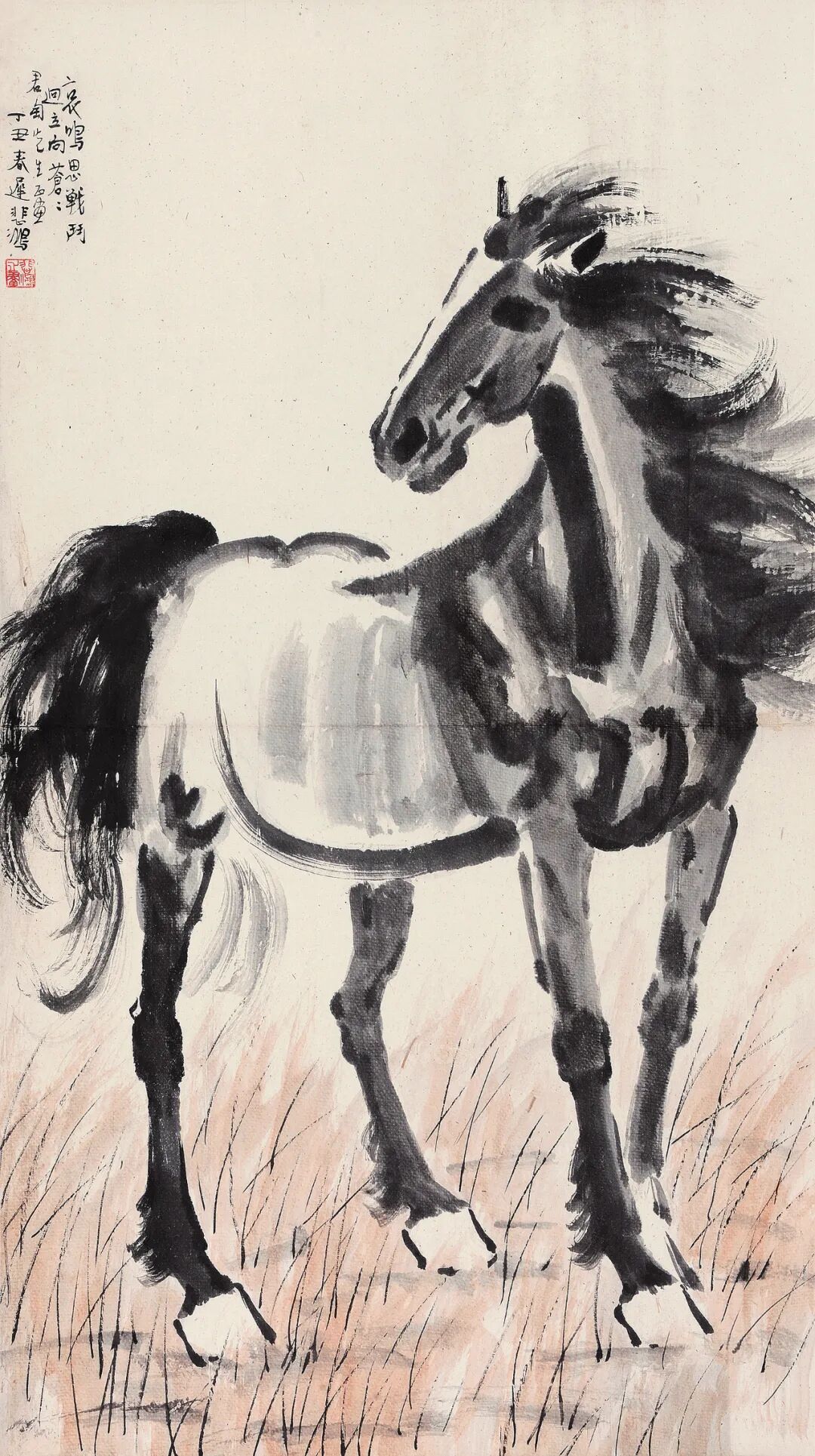 【题识】哀鸣思战斗,迥立向苍苍。君匋先生正画。丁丑春迟,悲鸿。【说明】上款人钱君匋(1907-1998),中国当代「一身精三艺,九十臻高峰」的著名篆刻书画家。曾任西泠印社副社长、上海文艺出版社编审、上海市政协委员等职。