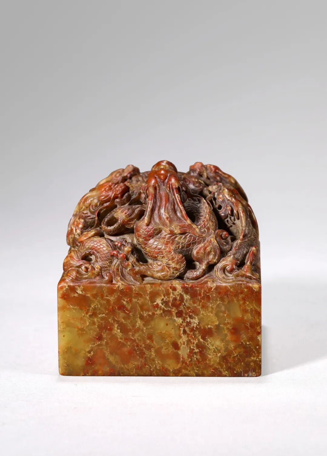 尺寸:H 14.0 cm,L 11.0 cm,W 10.0 cm笔筒选和田玉为材,玉质温润,随型雕琢,周身绘童子持莲花,嬉戏玩耍,童子有献福献寿之寓意,吉庆有余之寓意。屏心采用上等和田白玉制成,色泽莹亮,正面剔雕苍龙教子图景,布局严谨而有法度,工整庄重,一派皇家气度。苍龙与右下幼龙深情对望,二龙神形俱佳,栩栩如生,相顾之际,更得以妙笔传示出浓浓的殷切之情。龙首刻划细致,双目圆瞪,阔鼻,胡须随风飘扬,张嘴露齿,龙爪细长尖锐,技艺极为精湛。反面填金阴刻「云蝠纹」、「海水江崖纹」,纹饰布局规矩大方,精细精湛,生动形象。中间起框阴刻「乾隆庚寅 子孙永保」,字迹清晰,苍劲有力。乾隆庚寅:清乾隆三十五年,正月初一日,为乾隆六十寿辰;子孙永保,代表着乾隆皇帝在自己六十寿辰,希望子孙万代永远幸福安康。尺寸:H 15.5 cm,L 7.0 cm,H 19.0 cm白玉制成,玉质温润细腻,莹润光洁,立体圆雕寿星,寿星头顶高耸,弯眉圆鼻,长髯垂胸,胡须亦纤毫毕现,作喜笑颜开之态。双手作拱手状,身着大袖宽衣,衣纹自然流动,观寿星面容,满溢喜气洋洋之感,栩栩如生。寿星指南极仙翁,寓意长寿。整体造型优美,雕工精湛,神态逼真,构思巧妙,抛光极佳。带木座。来源:美国南加州橙县重要家族提供。本公司曾于2013年9月从此家族征集并拍卖一尊同时期满绿冰种翡翠观音,成交价$240,000整器用料高大,玻璃光泽明亮,翠色莹人,种水俱佳。整器采用圆雕精雕细琢而成,头顶螺发,眉如弯月,双目细长下视,鼻梁尖挺,唇线分明,白毫饰宝石,璀璨夺目,身穿长袍,手持寿桃,造型端庄,面带微笑,神情祥和,全身比例均匀,手脚写实细腻,衣纹起伏流走自然显质感。身前凤鸟站立,凤眼圆睁,眼角高挑,勾喙,曲颈引首,凤尾修长,极其华丽繁复,尤现高贵古雅之气。整器造型端庄,面相清秀,体态文静,面带微笑,神情祥和,全身比例均匀,手脚写实细腻,衣纹起伏流走自然显质感,层次分明,刀法线条含蓄刚劲,雕琢精湛,翠绿丰富,纹理清晰,用料质佳,为极其罕见的宫廷摆件。带灵芝纹木座。类似大小,工艺,年代,及种水相近的翡翠人物雕件,请参考芝加哥 Lizzadro 博物馆的镇馆之物「十九世纪清代翡翠仙女一对」(图1)。尺寸:17.82 x 12.84 x 7.55 mm,毛重 10.16 grams来源:重要洛杉矶华裔企业家家族收藏,约1970-1980购于香港