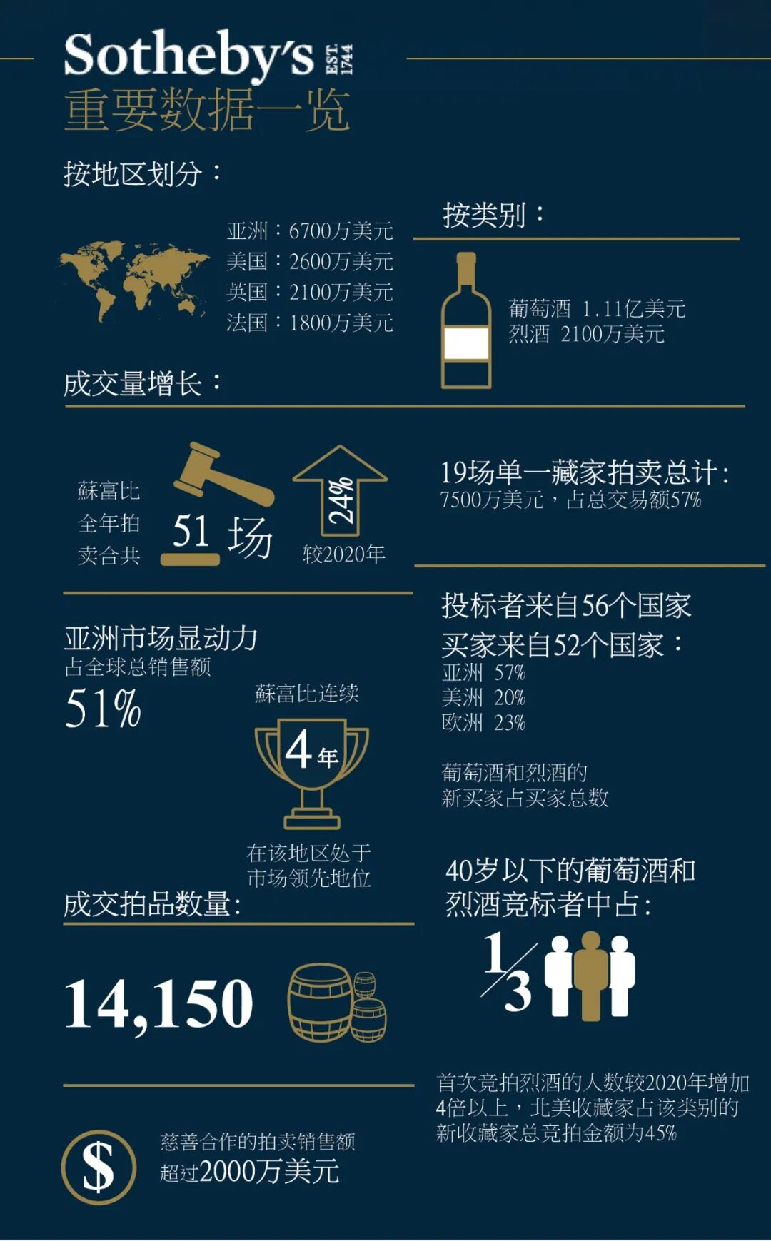 2021年将被铭记为蘇富比洋酒及烈酒业务充满变革的一年,推出一系列崭新构思及合作项目,在不同拍品类别及拍卖地区屡创佳绩。总成交额为1.32亿美元,创下历史新高,当中亮点包括: 蘇富比在亚洲傲领同侪,总成交额达 6,700万美元; 烈酒和洋酒成交亦见显著增长,而洋酒和威士忌同刷新拍卖纪录。此外,我们展开在欧洲大陆的销售,以及在亚洲推出首场普洱茶拍卖。今年的重点发展为蘇富比与伯恩济贫院和慈善机构「The Distillers Charity」呈献首场拍卖,我们与勃艮第酒商和苏格兰酿酒厂联手合作,筹集善款以支援当地社区。
