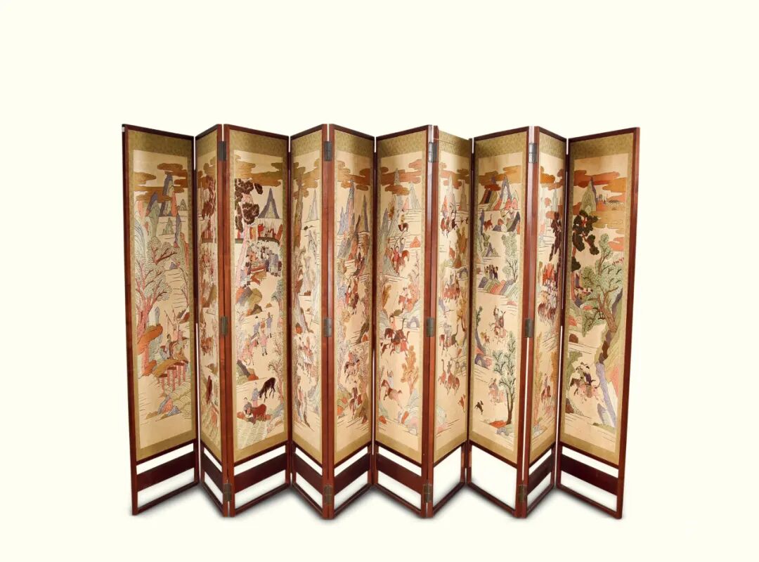 Lot 265 清代 绫地刺绣 出巡狩猎图纹 十折屏