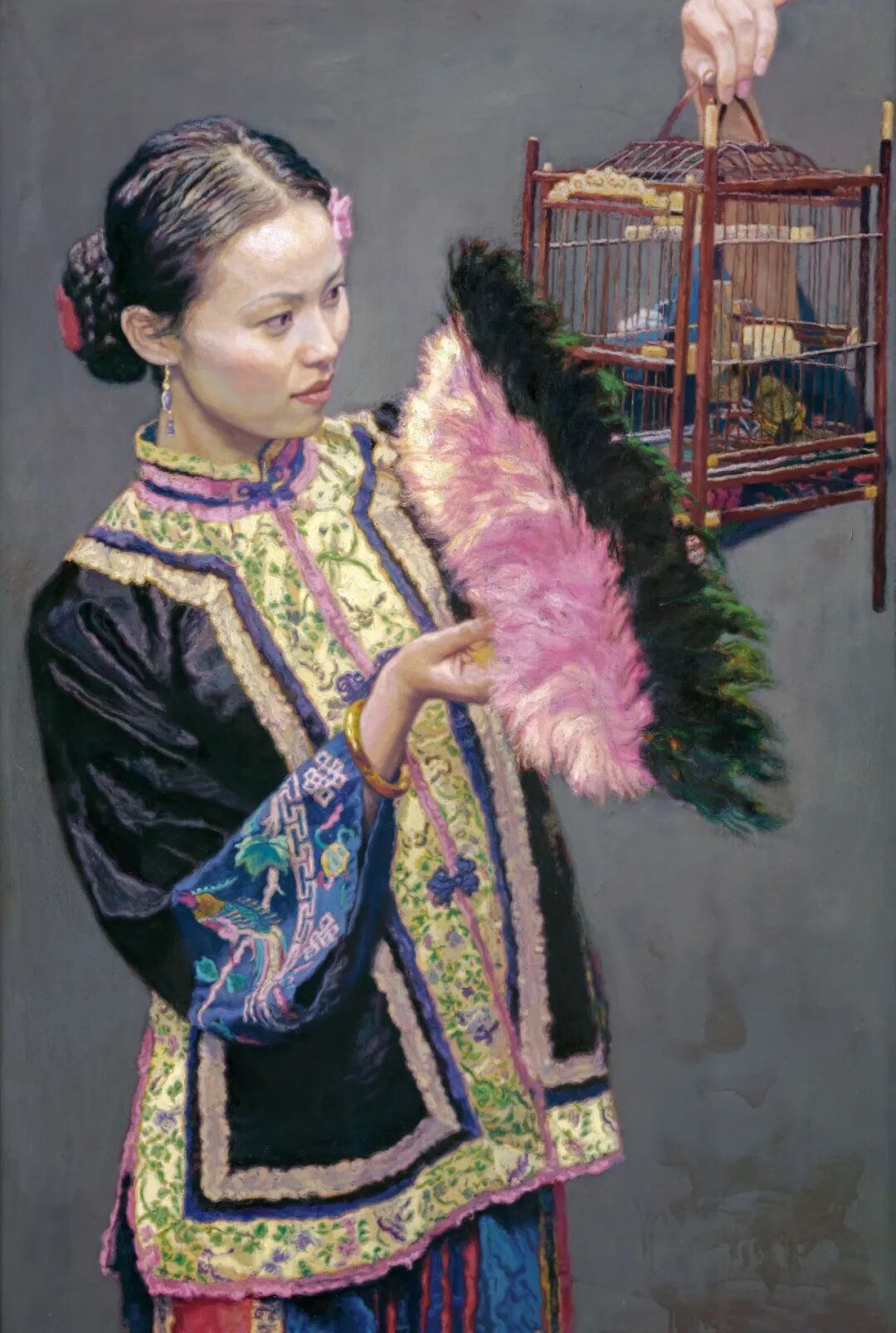 为了重塑神秘而瑰丽的“海上旧梦”,陈逸飞敏锐的捕捉老上海浮华生活的片段,并刻意以幽暗华丽的色彩渲染出诗意的情境。《提笼少女》便隶属于这一系列。画中衣着讲究的大家闺秀梳着精致的发髻,身着丝绸质感的华丽服饰,虽然衣料厚重,却无法遮掩底下女性肉体的纤柔与妩媚,优雅放松的神态显示出她的品味与富足。左手持鸟笼,与之对应的右手手持羽毛扇,鸟笼与羽毛扇以及右手像一条分割线一样将人物神情控制在左侧有限的空间里面,使观者自然而然的聚焦于人物的眼神进而又从女子的眼神投射到鸟笼细节的观摩。细节构图的巧妙安排是陈逸飞非凡创作能力的体现,而画面整体传达出的老上海气息则是艺术家对老上海文化心领神会之后的外现。
