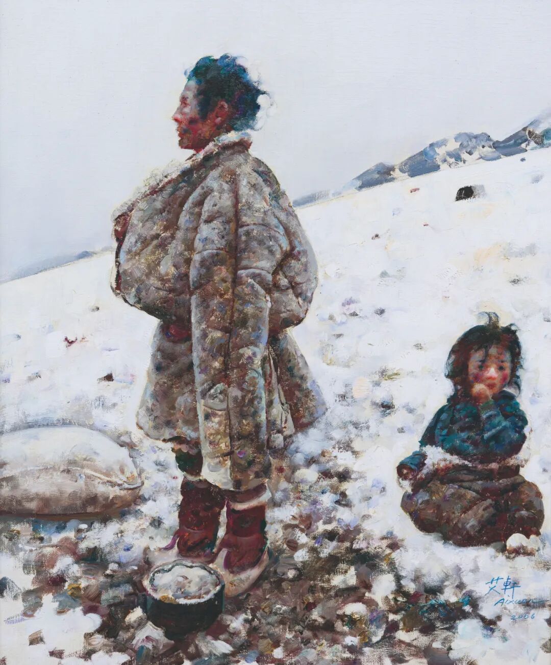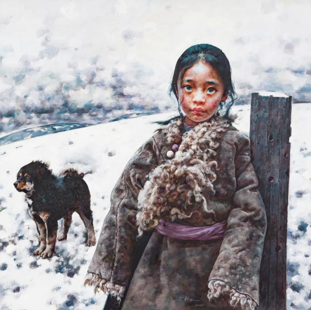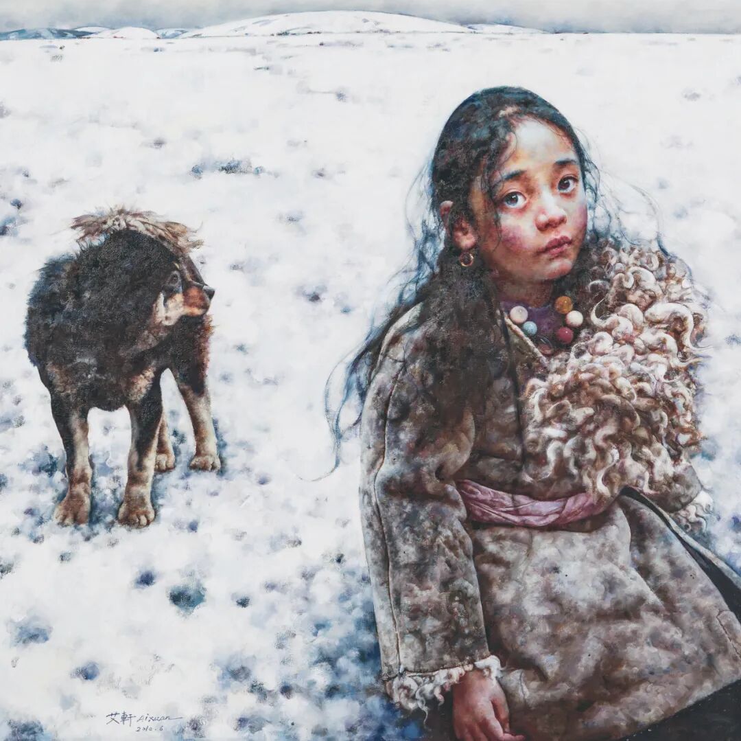 西藏是艾轩灵魂的寄存地。很多人会把艾轩对西藏的描绘看成写实的风景或者人物画,因为他们是那样的自然和生动,但是仔细看下去,画中的那些眼神,纯粹而宁静,充满着渴望,那些人物的脸庞也显得那样的不沾尘气、如梦似幻,这些人物,并不是传统写实意义上的真正意义上的人物,出现在艾轩作品中的人物,现实中他们也许存在,也许不存在,但是在画布上的表现却是虚无的,重新解构和创作的,是艾轩个人意念的体现。这种人物体的描绘,看似具象实则抽象,掩藏在写实下的是艾轩个人的意愿和理想,他在画布上是完全的上帝,他将自己的情感转换为具象的形体,真假参半,是他内心的独白,是他自我的完全释放和体现。那些纯净的眼神,正是艾轩澄净内心的写照。